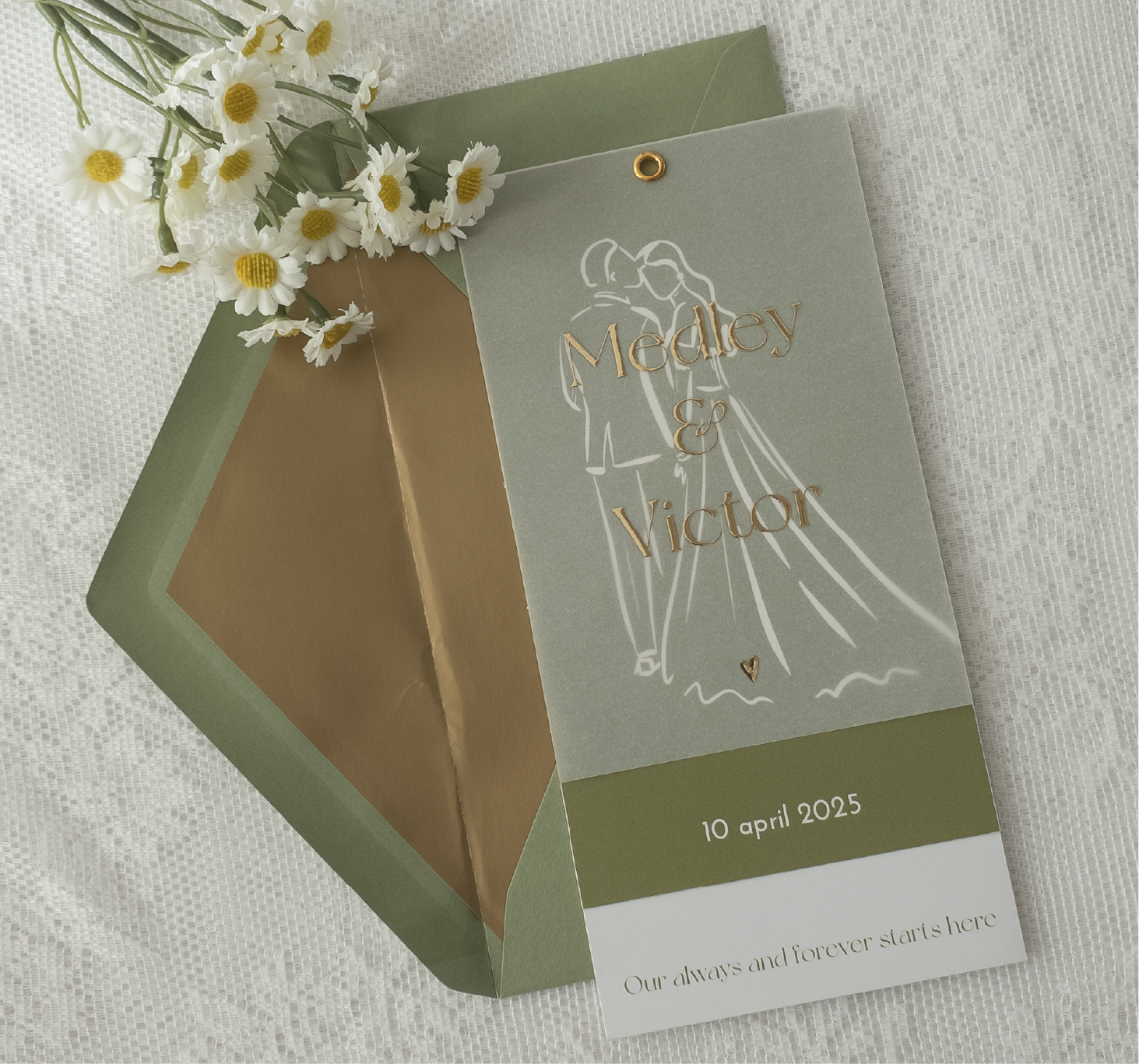 Kalkpapier voorblad behorende bij stapel trouwkaart van Medley en Victor. Let op: Je bestelt hier de kalkpapier voorkant die over de stapel trouwkaart heen komt. Deze bestel je er nog los bij. Daarnaast bestel je ook los de flenstang met ringetjes om de onderdelen aan elkaar te bevestigen. De kalkpapier voorkant bestel je in maat 10x15, zodat hij past bij de maten van de stapelkaart! De 3 onderdelen moet je zelf nog even perforeren voor de goudkleurige ringetjes. Gebruik hiervoor de flenstang, een gebruiksaanwijzing is mee geleverd. Om het je gemakkelijk te maken, wordt er op het kalkpapier vel een klein stipje afgedrukt, dit markeert de plek van het gaatje. Je hoeft de 3 onderdelen alleen maar netjes op elkaar te leggen en perforeren maar! Daarna knijp je met dezelfde flenstang het ringetje door de 3 kaarten heen.