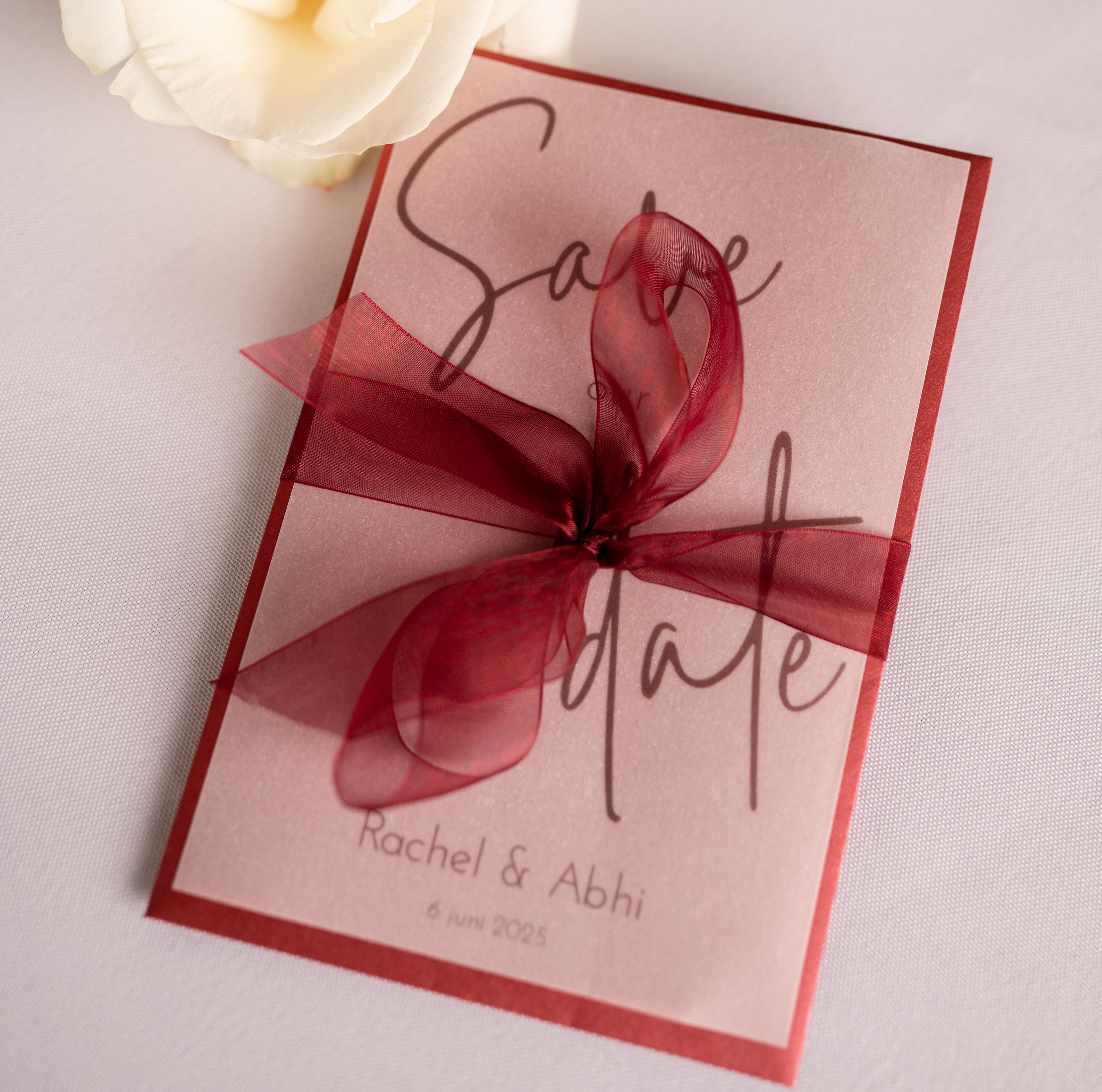 LET OP: Bestel deze save the date op 200 grams kalkpapier, zo is hij doorschijnend, maar ook mooi stevig!