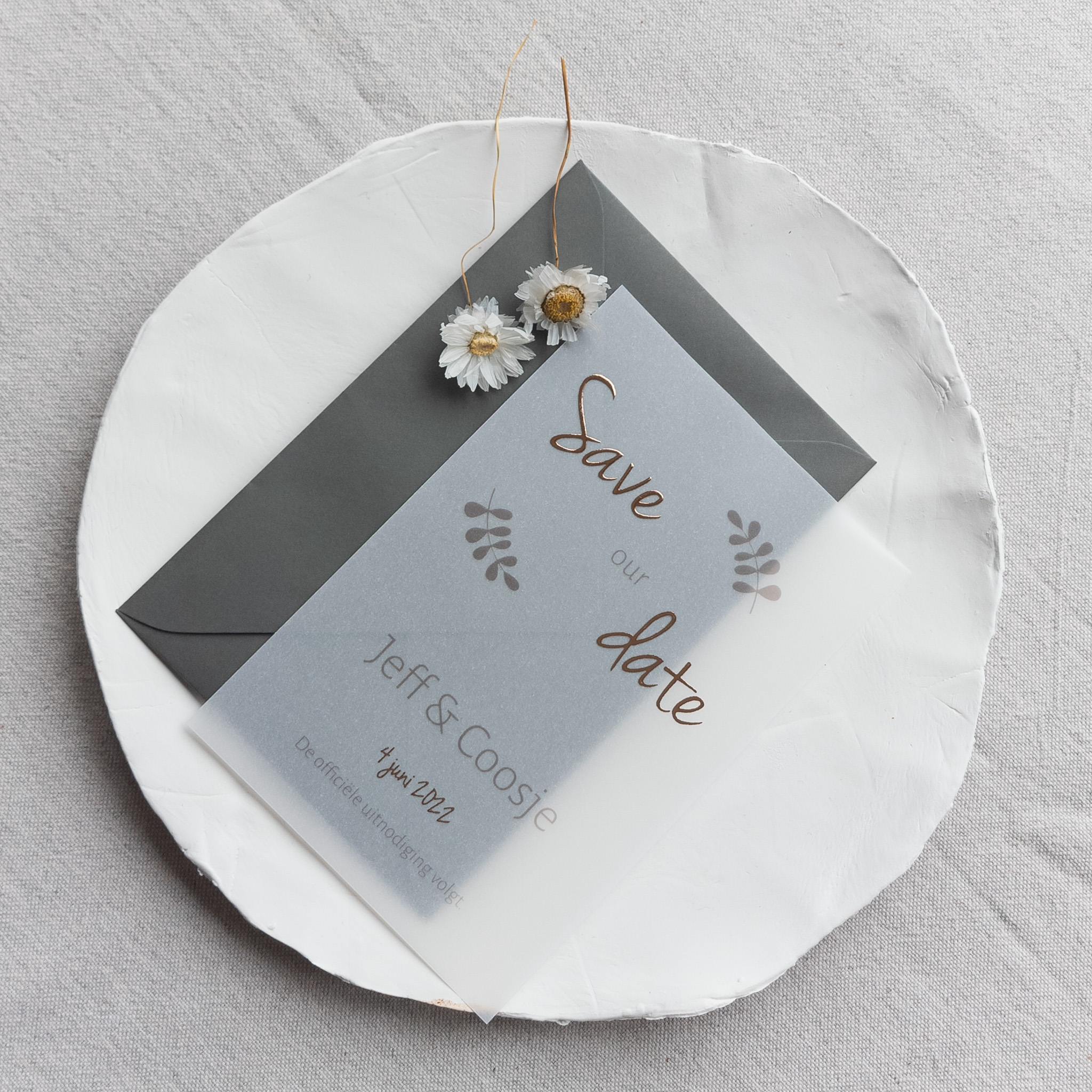 Save the date roséfolie blaadjes kalkpapier