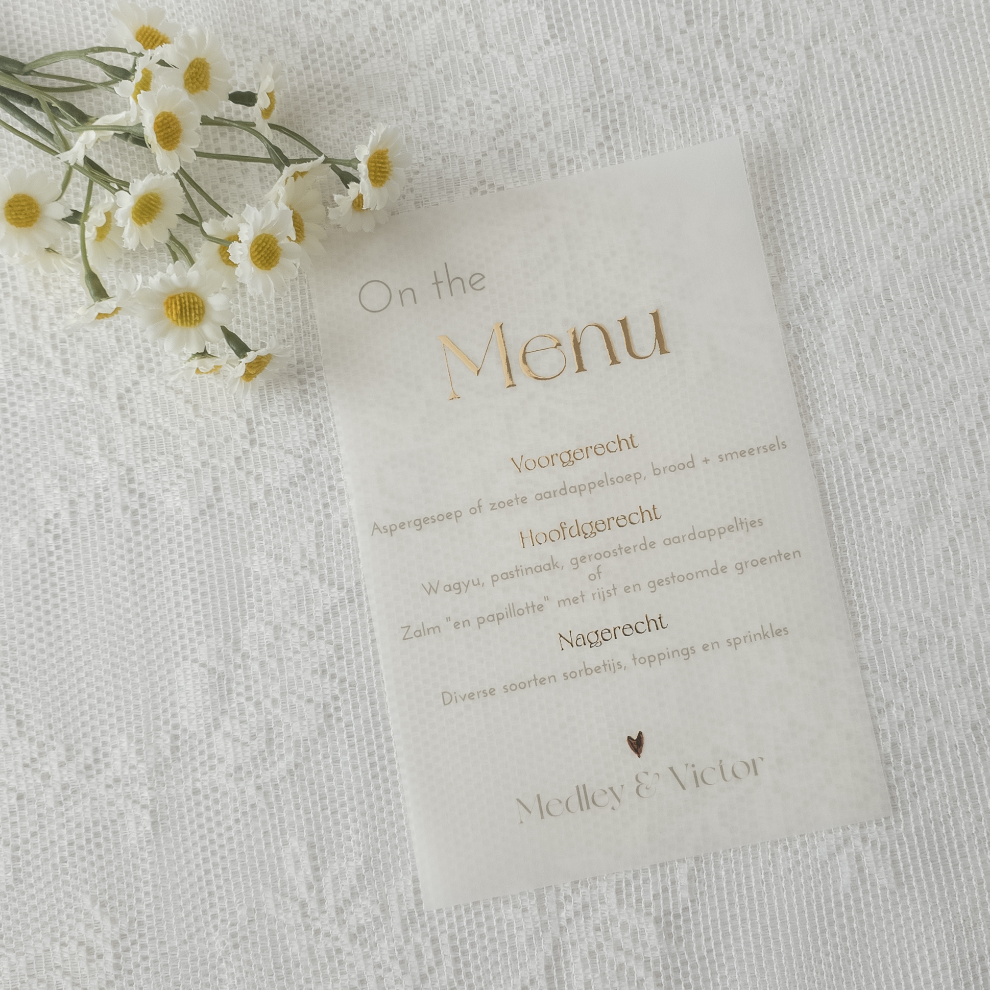 Passend bij de trouw huisstijl Meadow moments. Menukaart op kalkpapier, wat in de stationery terug komt en voor herkenning zorgt.