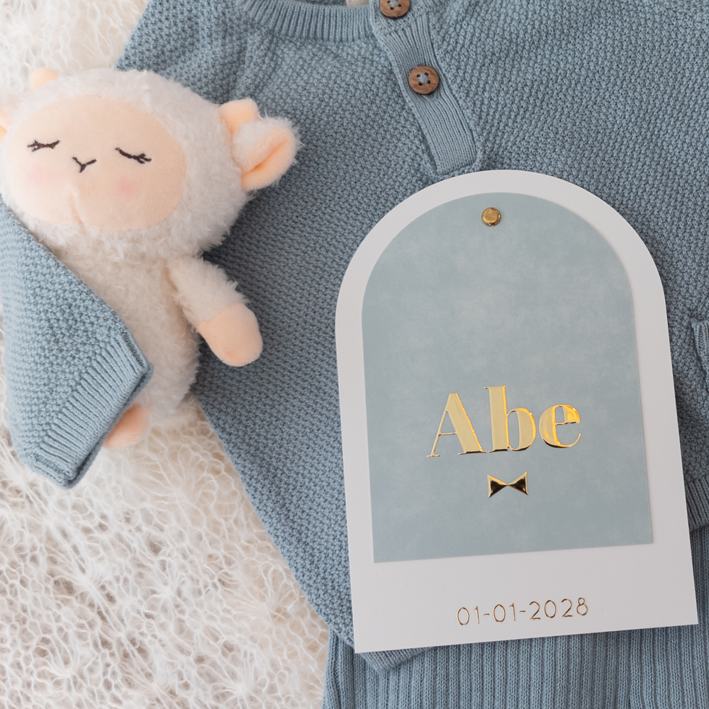 Geboortekaartje voor een jongen met een vlinderstrikje, velvet look print in wit en goudfolie.