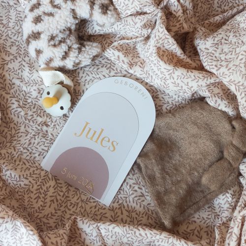 Label geboortekaartje in beige tinten met goudfolie