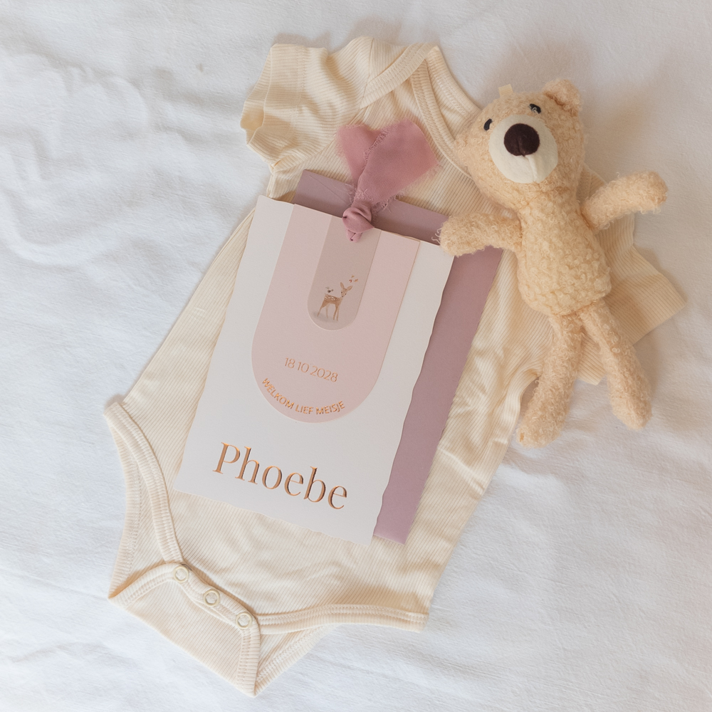 origineel geboortekaartje voor een meisje in roze tinten met details in roséfolie op de voor-en achterzijde, wat de kaart een subtiel extra vleugje luxe geeft.