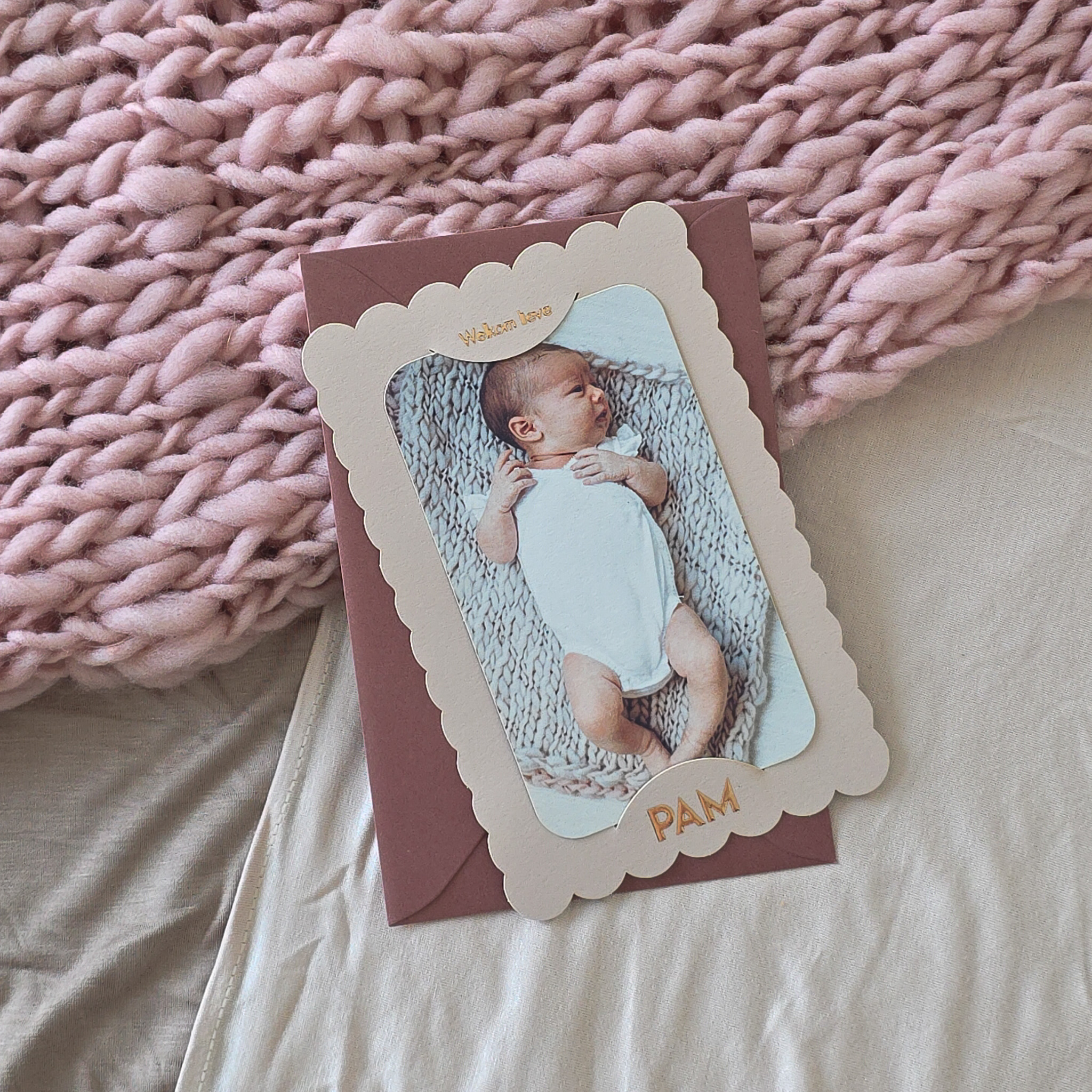 Uniek geboortekaartje in koekjesvorm waar 2 uitsparingen in zitten om het bijbehorende fotokaartje tussen te schuiven. De foto kun je eenvoudig vervangen voor die van jullie kleintje. Pas de kleuren naar wens aan, maar hou de achterzijde donker in verband met eventueel zichtbare lasersnij randjes.