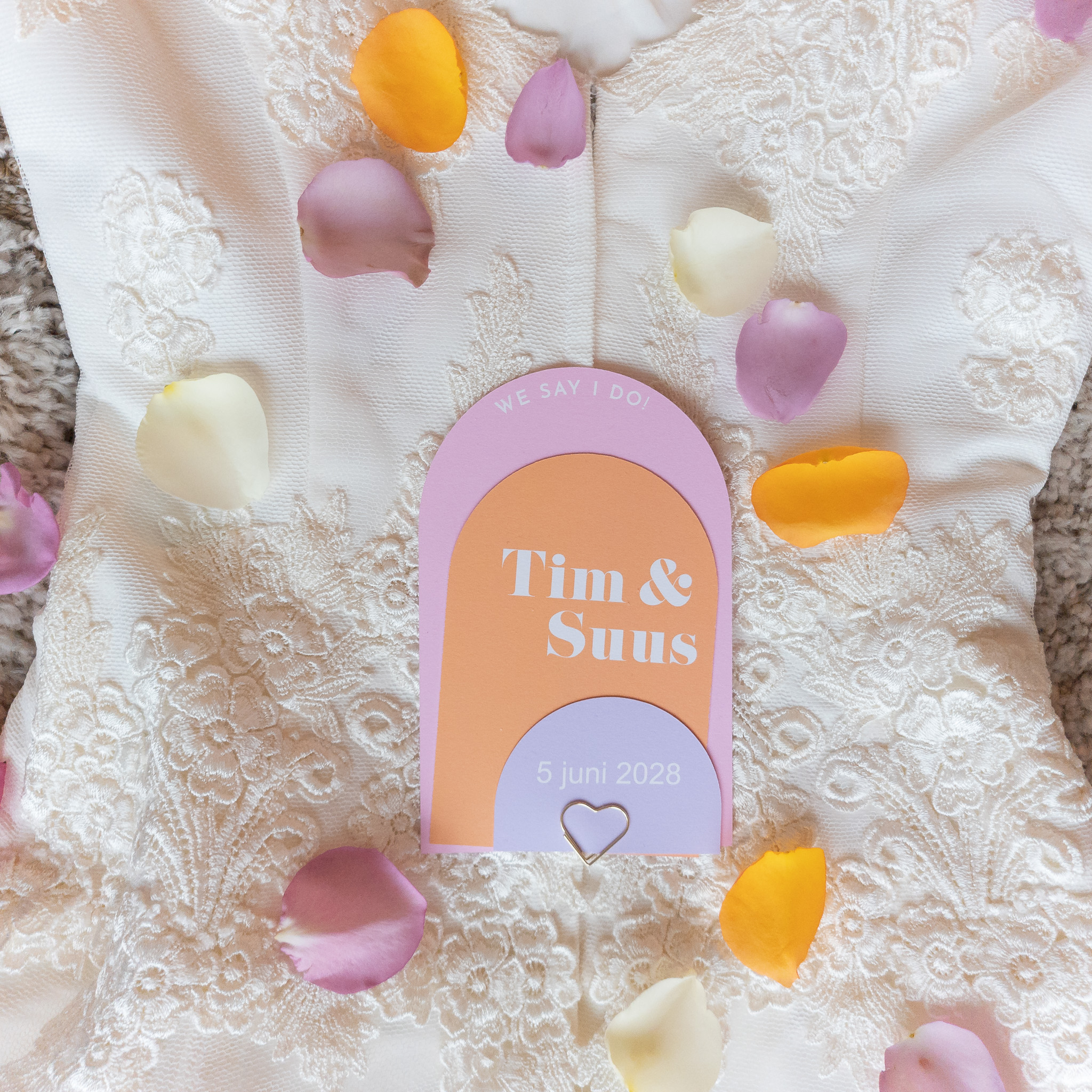 Kleurrijke trouwkaarten in het kleurenpalet van een fleurig bruidsboeket! Verras je gasten als ze de envelop open maken met een onvergetelijke eerste indruk. Deze trouwkaart bestaat uit 3 delen. Je ontvangt alle 3 de delen, vergeet niet je paperclips, touw of lint bij te bestellen om de kaart bij elkaar te houden als set. Je kunt zelf nog een andere kleur combinatie kiezen, Het lettertype aanpassen of een foto toevoegen van jullie samen!