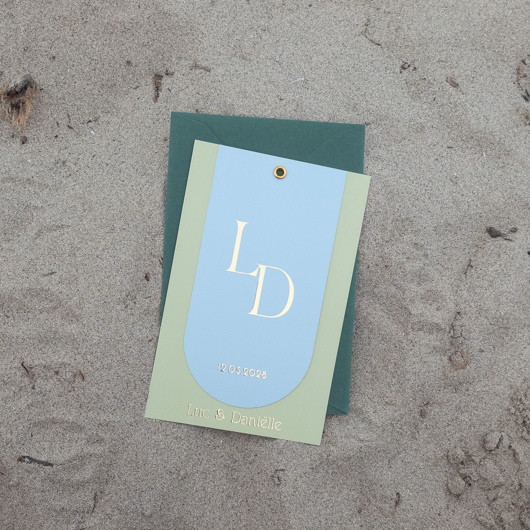 Kleurrijke trouwkaart in groen blauw met goudfolie. Leg de blauwe boogkaart in het midden van de groene kaart. Bestel hierbij de flenstang en de flensringetjes, zodat je de gaatjes kunt maken op de plek van het stipje en vervolgens het ringetje door de kaart heen knijpt.