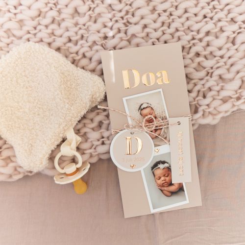 Unieke geboortekaartjes? Yes please!! Kies dan voor deze kaart! De kaart komt in een set van 4 onderdelen: De kaart zelf ( 10x 21 cm ), een fotostrip, een langwerpig label en een rond label. Je kunt de kaart vormgeven naar eigen wensen. Je kunt de kleuren en de lettertypes aanpassen en voor een andere foliekleur kiezen. De foto's kun je via de beeldbank uploaden vanaf je eigen computer. Hulp nodig bij het vormgeven van jouw exclusieve geboortekaartjes? Stuur me een berichtje en ik help je!