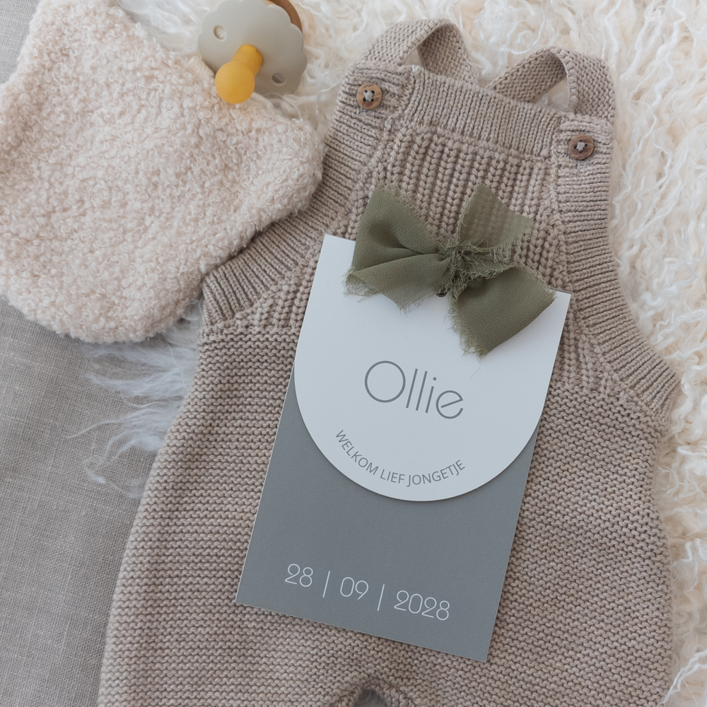 geboortekaartje voor een jongen bestaande uit 2 delen: de grootste kaart is 10x15 cm en heeft een gaatje. Het label wat er overheen hangt heeft ook een gaatje, zodat je de beide delen aan elkaar kunt bevestigen met een splitpen of lint. Ik gebruikte hier 36 cm van het sage groene lint en paste daar ook de achtergrond kleuren van het kaartje op aan.