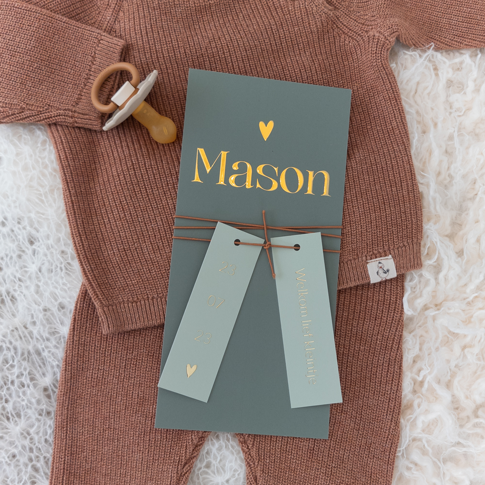 Wil jij een stoer geboortekaartje in groen voor jullie zoon? Deze kaart is in 2 kleuren groen vormgegeven en heeft 2 schattige labeltjes die je met lint of touw aan de kaart bevestigt. De kaart met labels wordt afgedrukt op een vel van 21x21 cm, zo ontstaan de 3 onderdelen welke je thuis zelf in elkaar zet. De grote kaart heeft een afmeting van 10x21 cm. Het formaat van de bijpassende envelop: 22x11 cm.