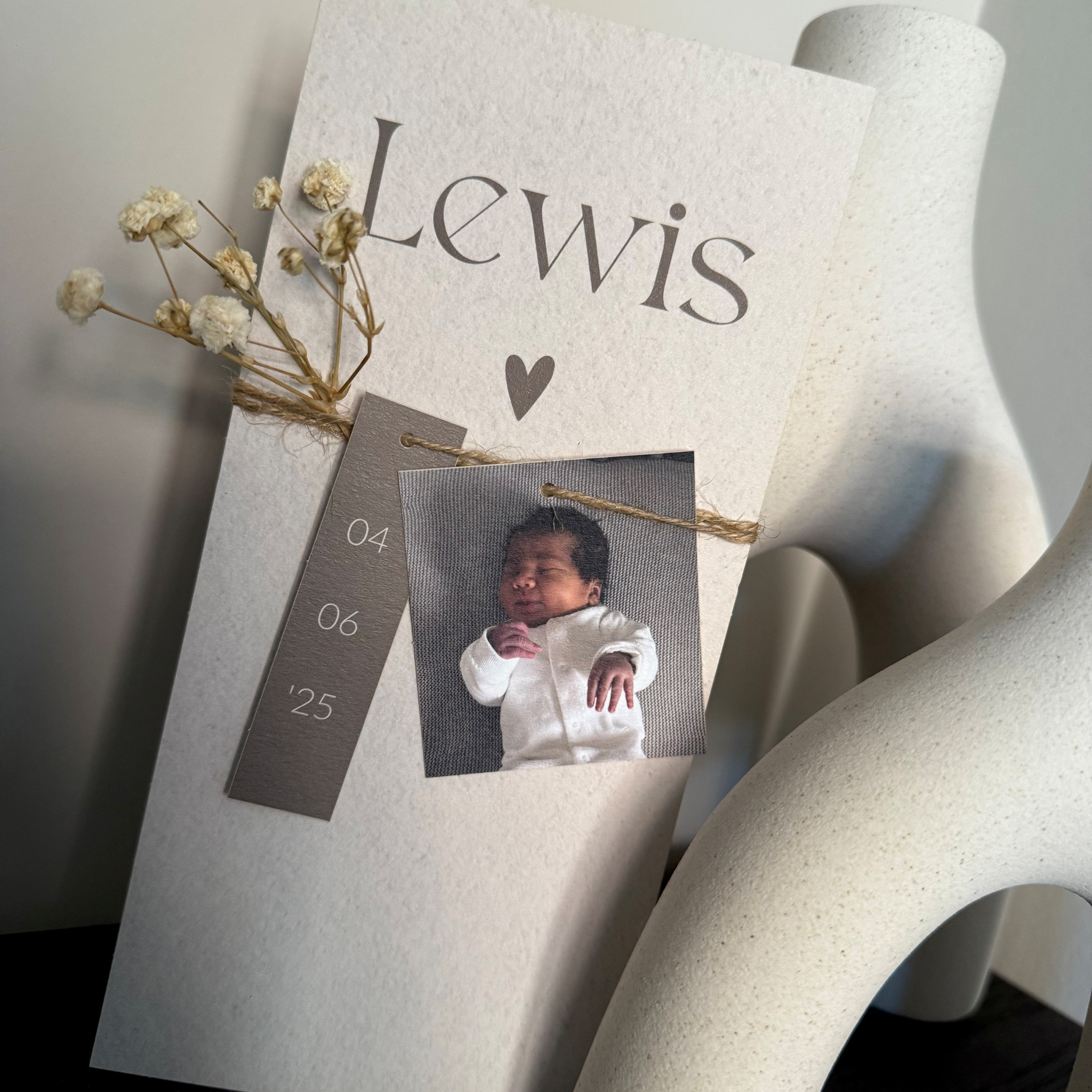 Unisex geboortekaartje met kraft look papier en 2 labeltjes die je met lint of touw aan de kaart bevestigt. De kaart met labels wordt afgedrukt op een vel van 21x21 cm, zo ontstaan de 3 onderdelen welke je thuis zelf in elkaar zet. De grote kaart heeft een afmeting van 10x21 cm. Het formaat van de bijpassende envelop: 22x11 cm.