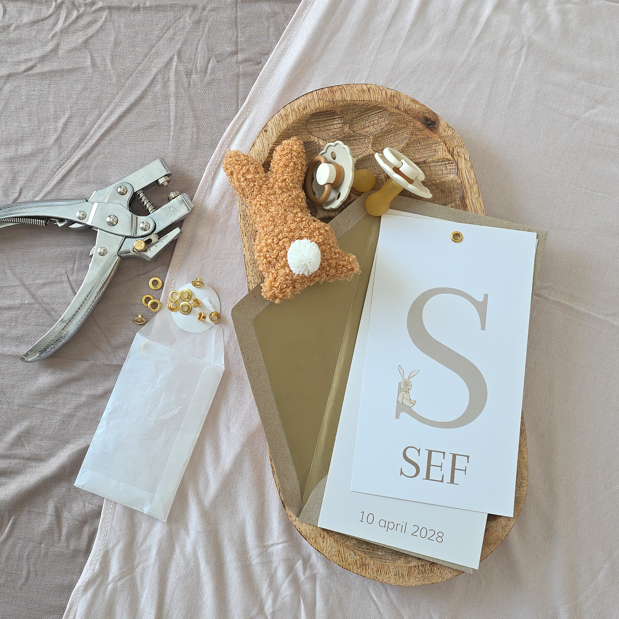 Stapelkaart geboortekaartjes zijn uniek en origineel. Super lief met de begin letter en een toegevoegd diertje! Hier zit een konijntje op de letter, maar in de beeldbank vind je nog veel meer van deze lieve diertjes om mee te combineren.