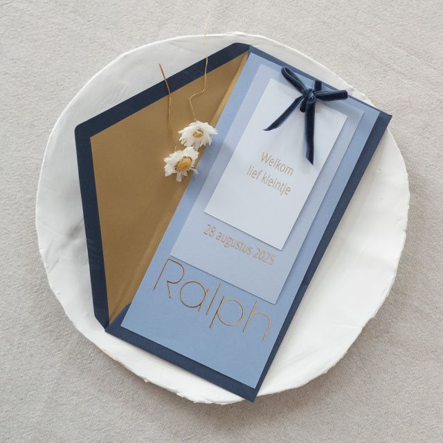 Jongens geboortekaartje in 3 blauw tinten met 2 labels