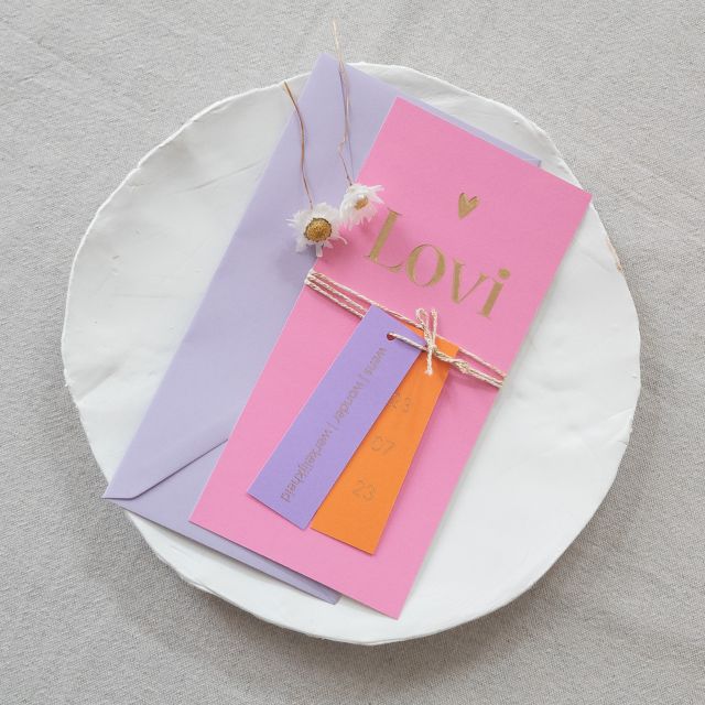 Wil jij een geboortekaartje met kleur voor jullie dochter? Deze kaart is in 3 knalkleuren vormgegeven en heeft 2 schattige labeltjes die je met lint of touw aan de kaart bevestigt. De kaart met labels wordt afgedrukt op een vel van 21x21 cm, zo ontstaan de 3 onderdelen welke je thuis zelf in elkaar zet. De grote kaart heeft een afmeting van 10x21 cm. Het formaat van de bijpassende envelop: 22x11 cm.