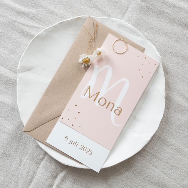 Lief stapel geboortekaartje in kleurstelling wit roze met goudfolie. Verras familie en vrienden met dit prachtige geboortekaartje. Hier afgedrukt op linnen papier, wat een mooie uitstraling geeft aan dit kaartje. De achterste kaart heeft een afmeting van 21x10 cm en daarbij past een envelop met afmeting 22x 11 cm. Vergeet niet je paperclips mee te bestellen!
