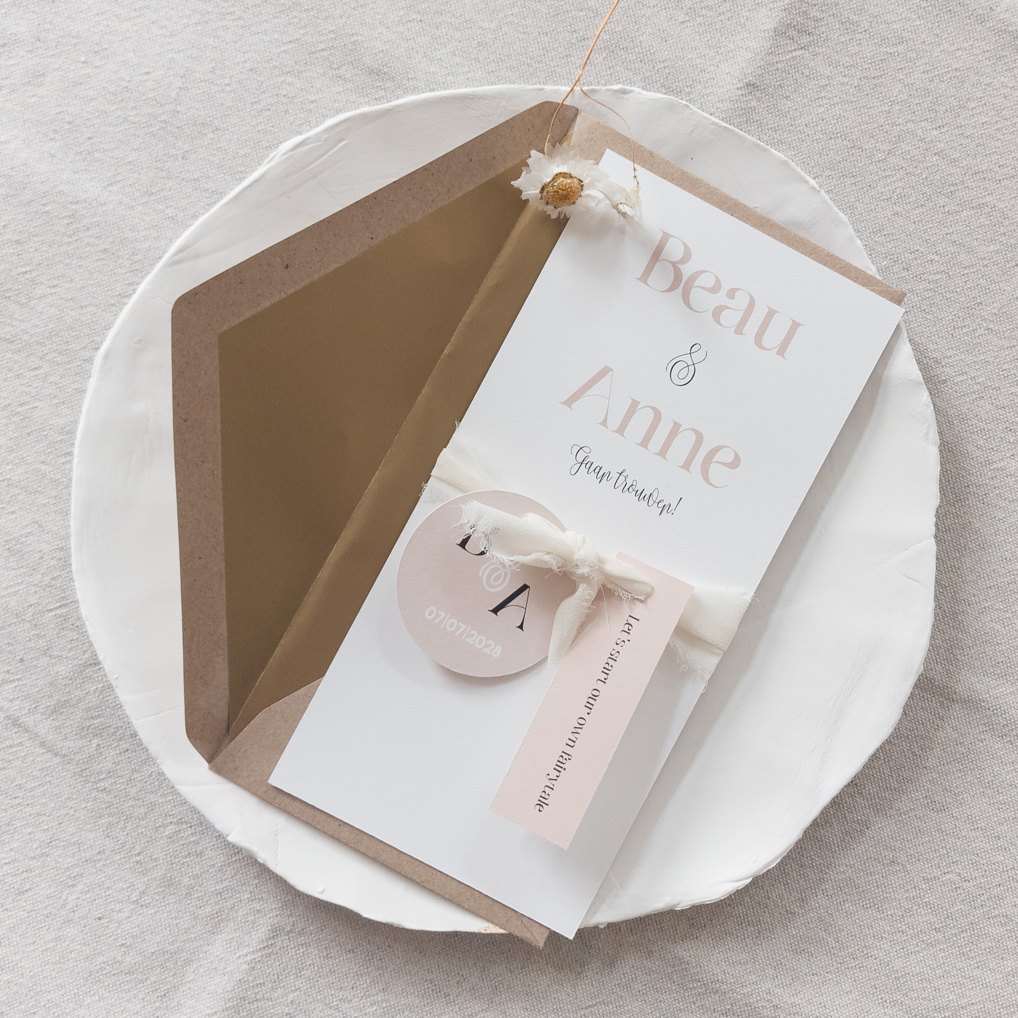 Ik gebruikte hier wit, beige en zwart in deze chique bruiloft uitnodiging. Je kunt ervoor kiezen om de kaart naar eigen idee om te zetten: pas de kleuren en lettertypes aan en voeg eventueel foliedruk toe. Ook kun je er voor kiezen om op het ronde label een foto van jullie samen af te drukken.