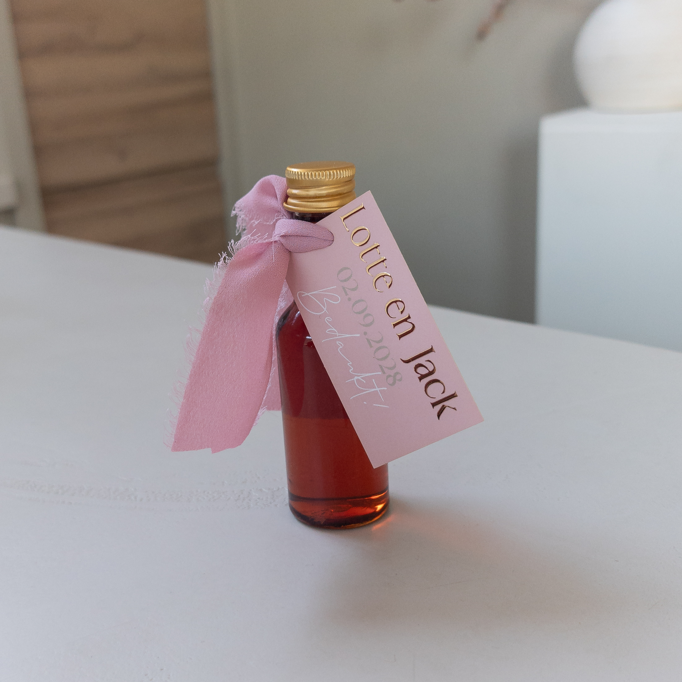 Dit label kun je zelf naar wens vormgeven en aan je zelf bedachte trouw bedankje hangen. Hij is 7 cm lang en 3.5 cm breed en heeft een gaatje aan de linkerkant. Natuurlijk kun je hem ook verticaal gebruiken!
