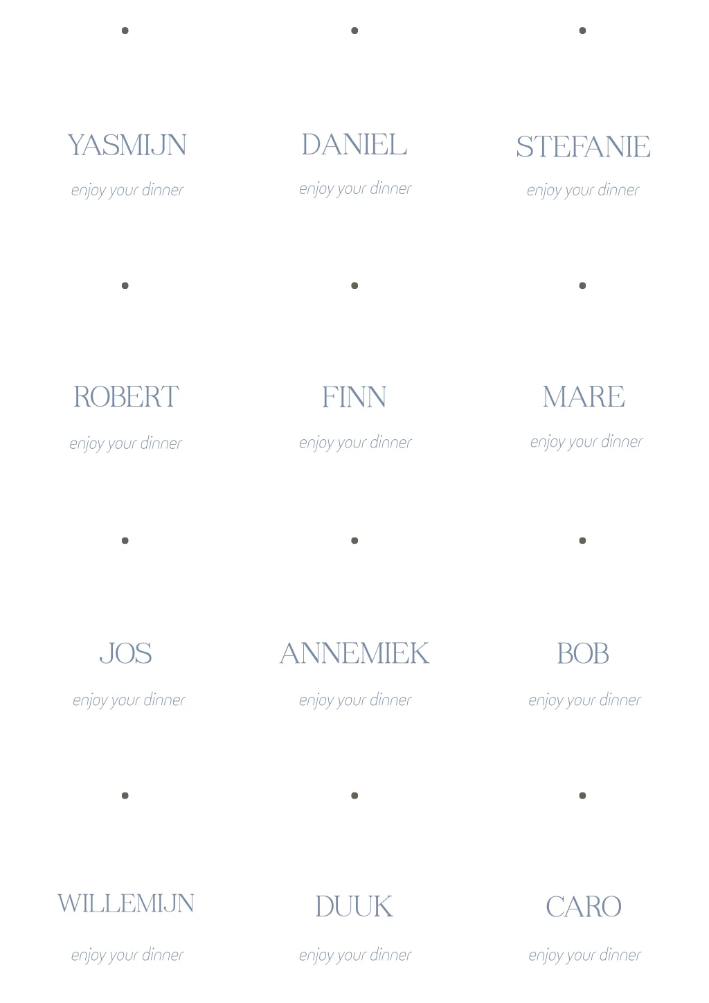 Stijlvolle naamkaartjes met blauwe tekst en een stipje om je te helpen sturen waar het gaatje moet komen.
