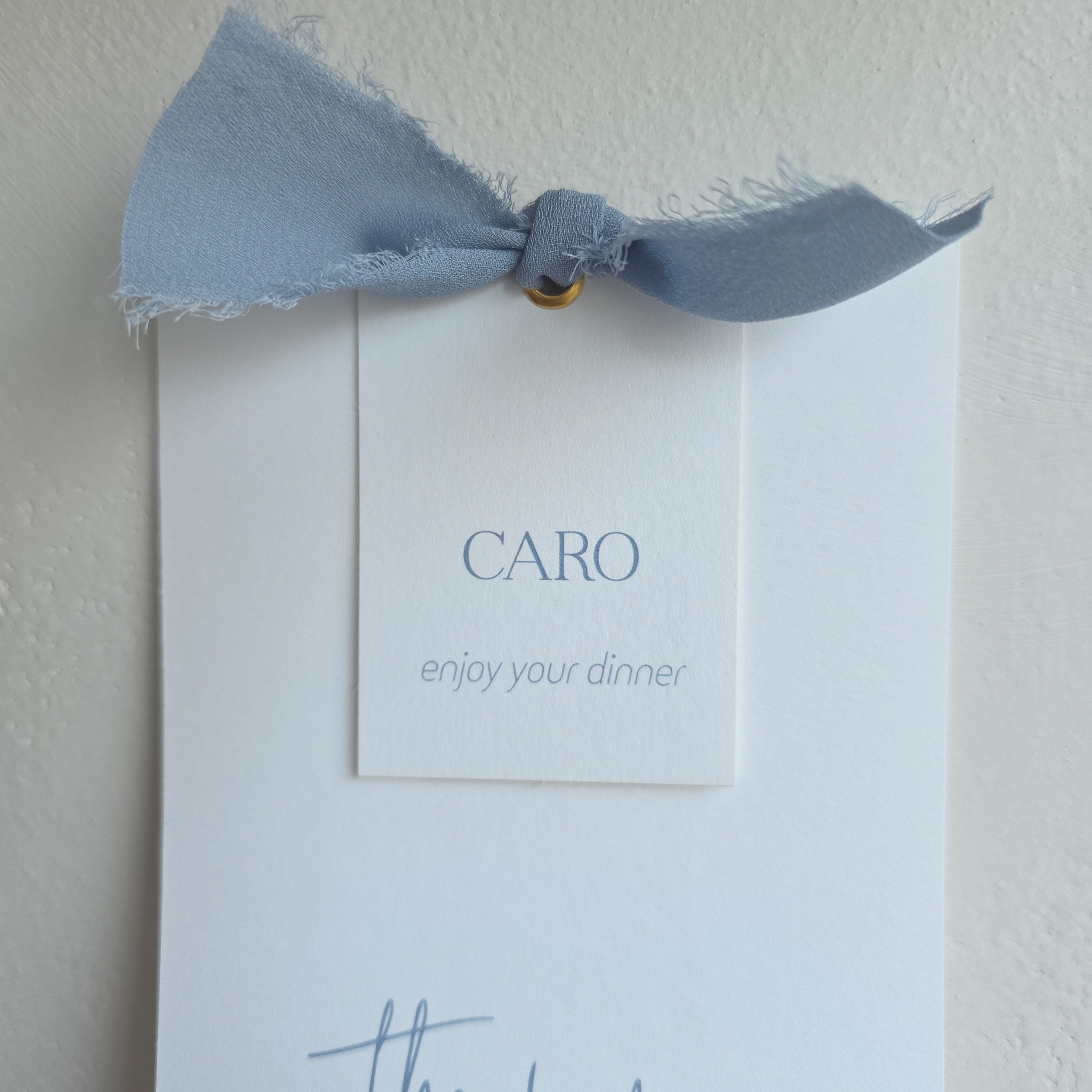 Leg het naamkaartje in het midden van de bijpassende menukaart en knip met de flenstang een gaatje. Vervolgens leg je het gouden ringetje in het gaatje en knijp je deze dicht zodat het naamkaartje aan de menukaart vast zit. In het voorbeeld voegde ik een simpele enkele knoop toe met het blauwe lint. Je hebt dan 15 cm nodig per kaart. Lint, ringetjes en tang bestel je nog los bij.