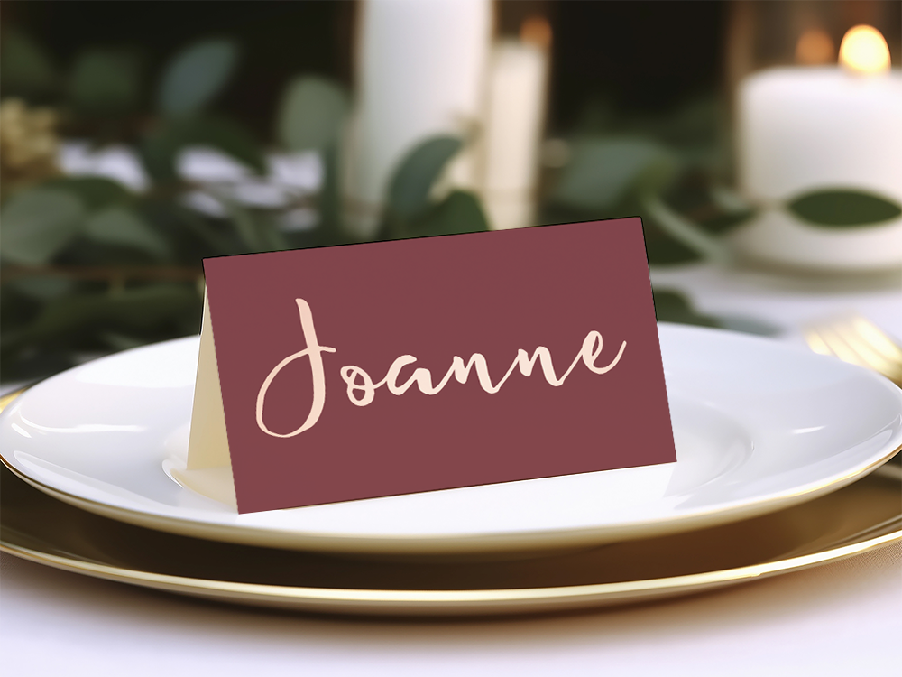 Deze naamkaartjes passen bij de huisstijl van Robert en Joanne! Pas ze naar wens aan. De kaartjes hebben een vouwlijn in het midden zodat ze zelf kunnen staan. Zie jij de gedekte tafels voor je, met deze naamkaartjes op ieder bord?