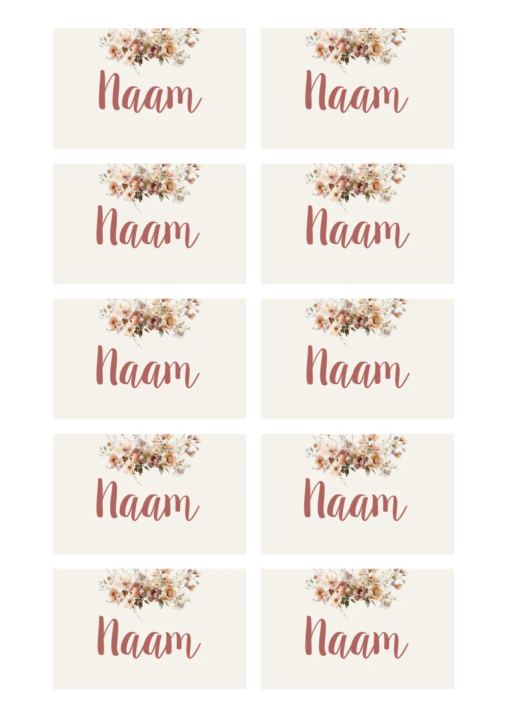 Naamkaartjes in 5x8 cm passend bij trouwhuisstijl floral chic. Vul de namen in en bestel met 1 druk op de knop jouw naamkaartjes. Je kunt deze naamkaartjes gebruiken voor plaatsaanduiding tijdens de ceremonie, maar je kunt ze ook hergebruiken bij de tafelschikking tijdens het diner.