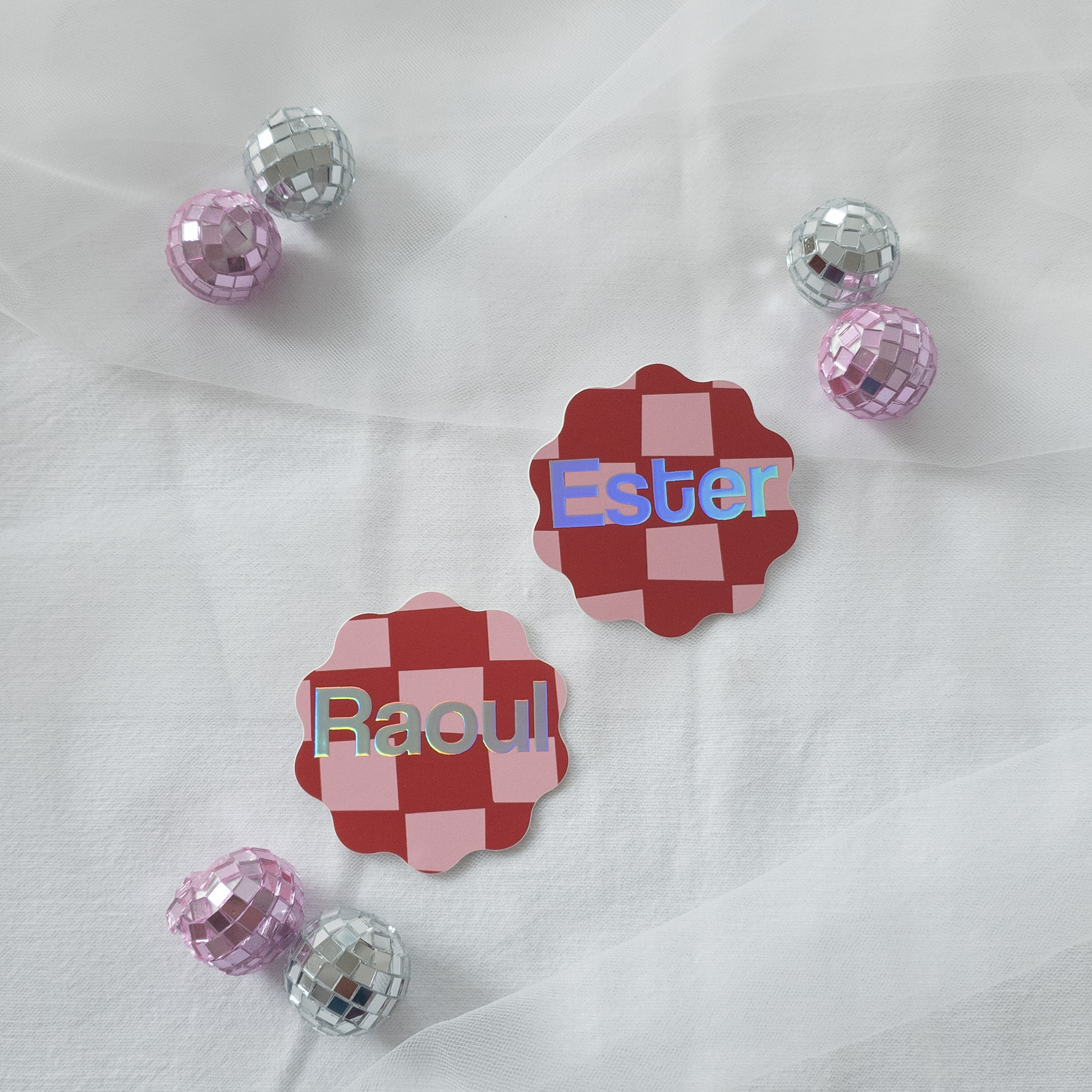 Naamkaartjes grillig rond geblokt holografisch folie