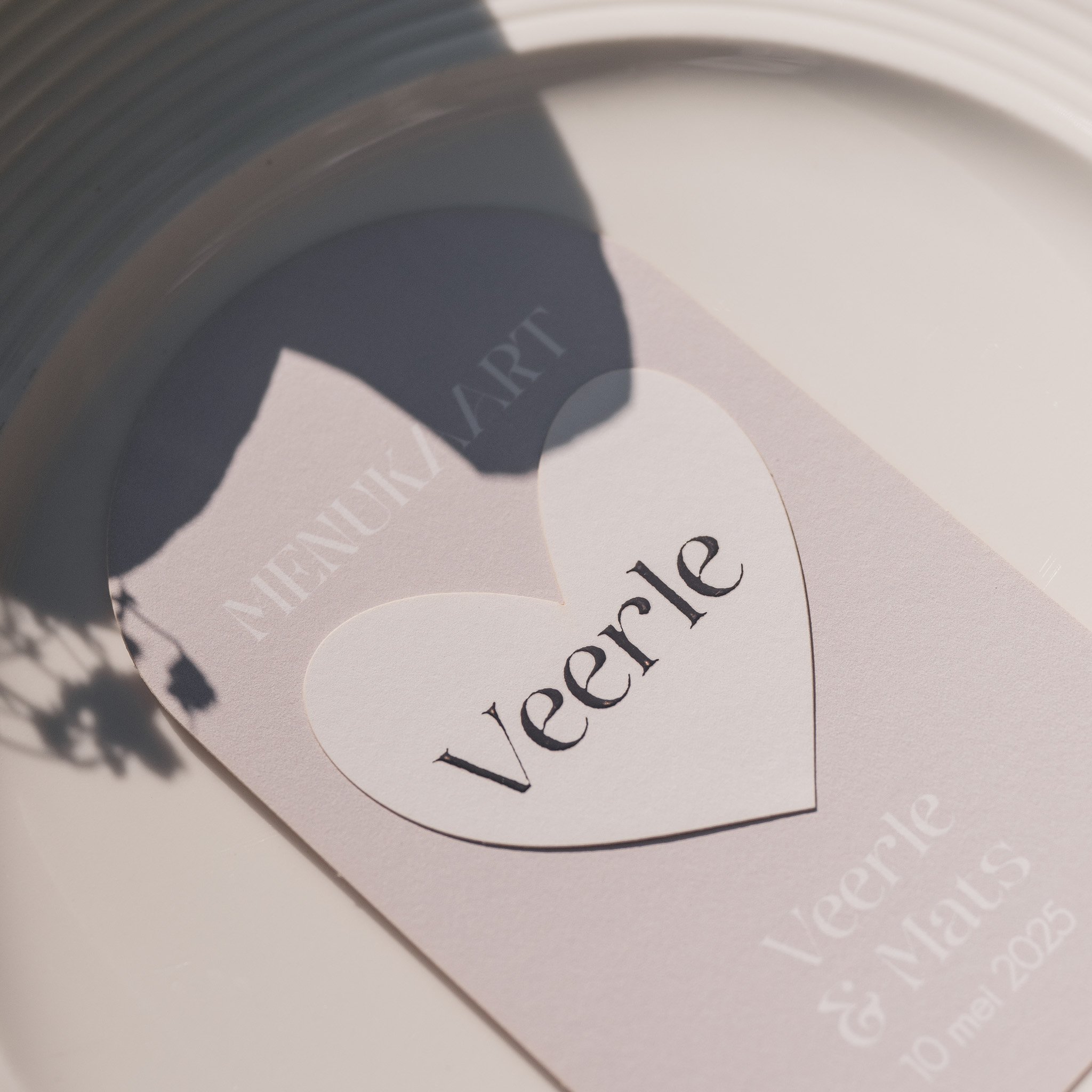 Deze toffe naamkaartjes zijn ongeveer 6,5 bij 5,8 cm. Ze passen geweldig bij de trouw huisstijl Bridal blush van Veerle en Mats en kleuren mooi met de bijpassende menukaarten. Op dit stansvel zitten 10 naamkaartjes en de namen zijn in roséfolie gedrukt. Pas dit gerust aan naar inktkleuren als je dit mooier vindt!