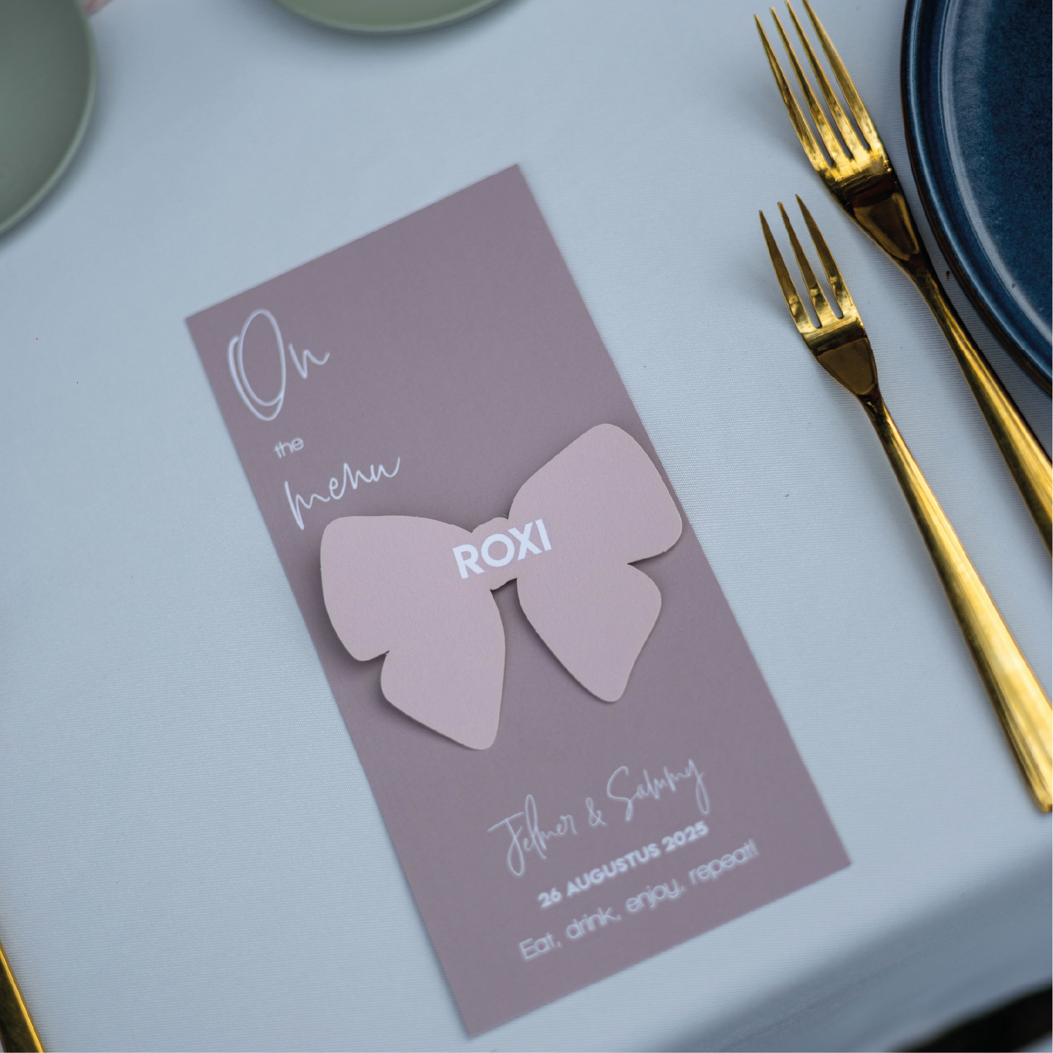 Let op dat je de naamkaartjes in dezelfde papiersoort als de menukaarten bestelt, voor een mooi strak geheel!