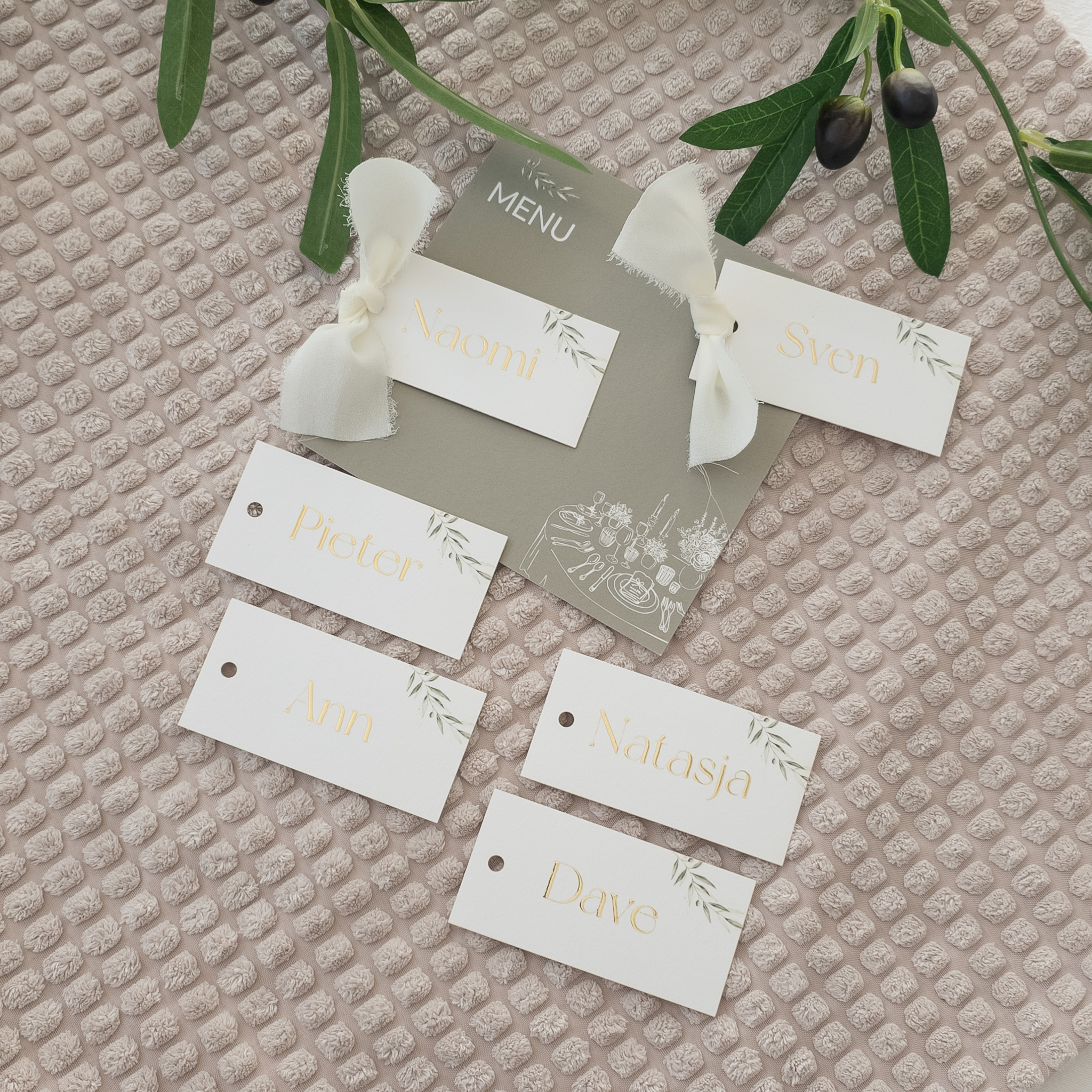 Naamkaartjes Olive green in de afmeting 8x4 cm met een gaatje voor het olijfgroene lint. Er zitten 12 kaartjes op een vel, die je gemakkelijk kunt dupliceren zodat je zoveel vellen kunt maken als je wilt. De namen worden hier in goudfolie gedrukt en de achterkant van de kaartjes blijven onbedrukt.