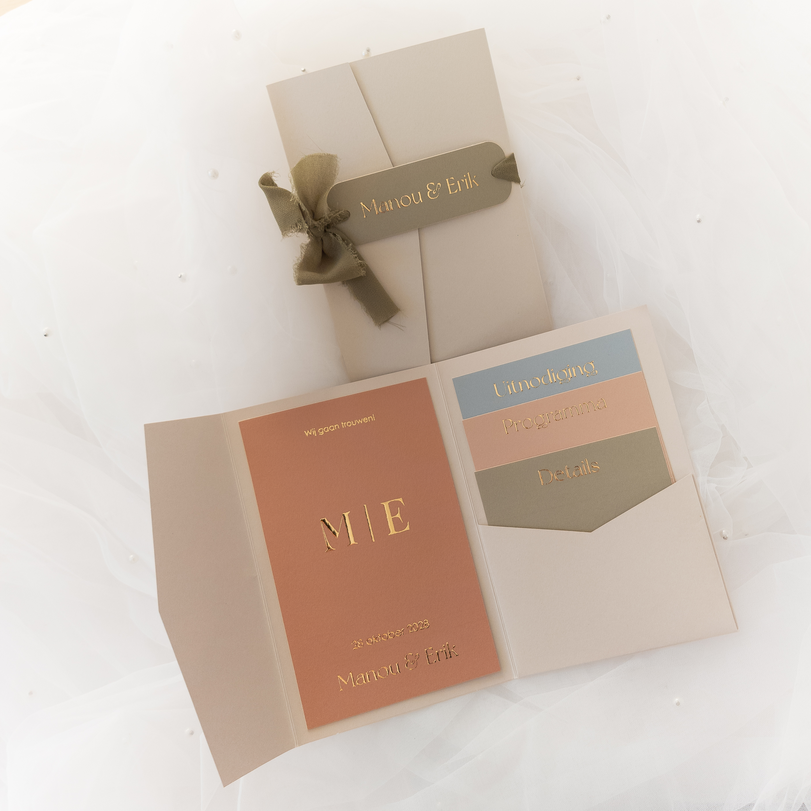 Pocketfold minimalistische trouwkaart set in rustige kleuren en goudfolie accenten. Genoeg ruimte om het programma voor jullie grote dag kwijt te kunnen!