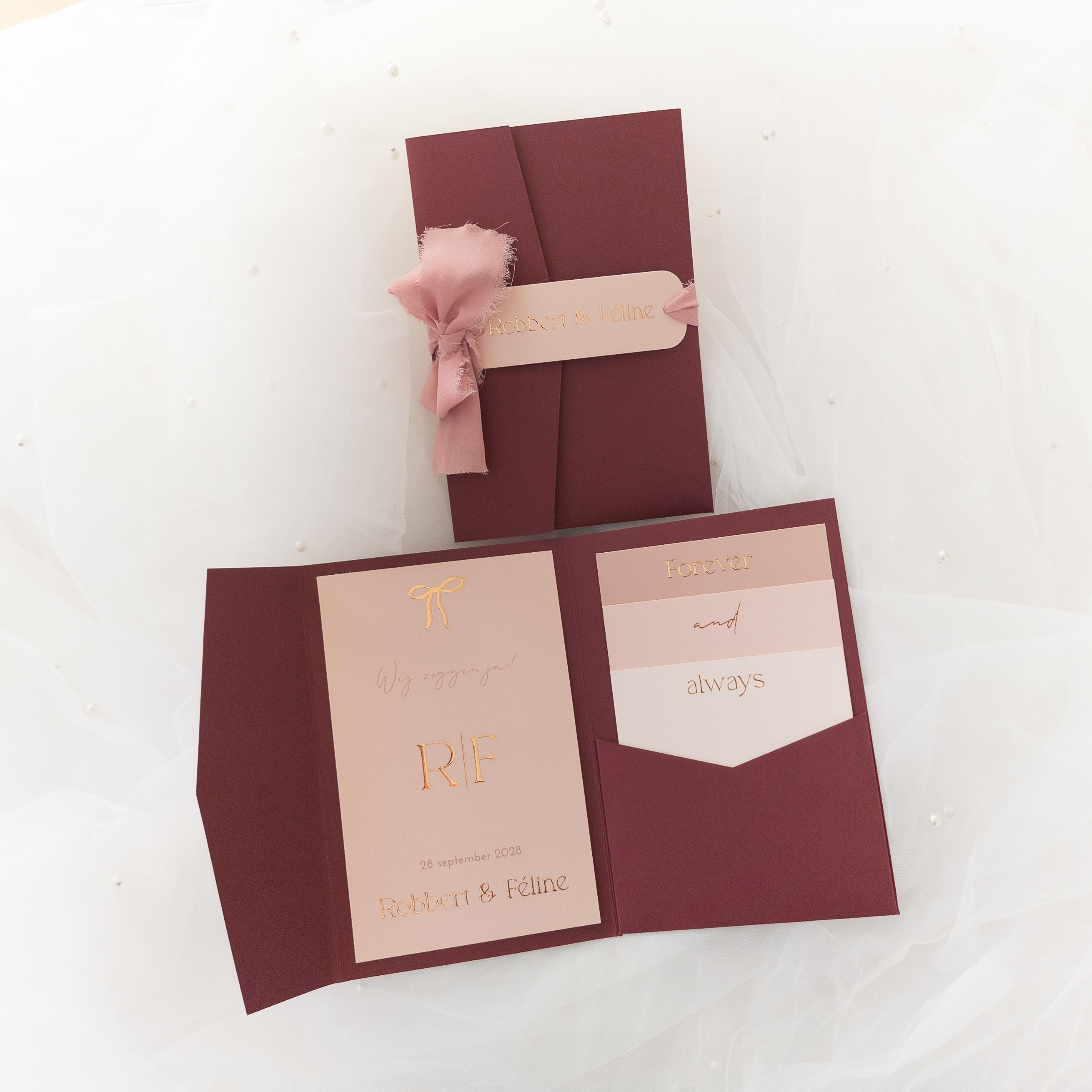 Op zoek naar de perfecte trouwkaart voor jullie grote dag? Ontdek onze prachtige Pocketfold trouwkaart set in chique blush roze tinten met schitterende roséfolie accenten. Deze set bevat 4 kaarten en een label, waardoor je voldoende ruimte hebt om alle belangrijke informatie over jullie bruiloft te delen. De mogelijkheden zijn eindeloos, aangezien je de kaartkleuren, lettertypes, foliekleur, achtergrondafbeeldingen en meer naar wens kunt aanpassen. Deze stijlvolle pocketfold trouwkaart set komt prachtig tot zijn recht in combinatie met de cloud grey pocketfold. Het mapje kun je eenvoudig sluiten met lint of touw, waar je het bijpassende label doorheen rijgt voor een extra persoonlijke touch. Vergeet niet om het pocketfold mapje en het lint apart bij te bestellen voor de complete set. Met deze unieke trouwkaart creëer je een onvergetelijke eerste indruk voor jullie speciale dag. Robbert en Feline