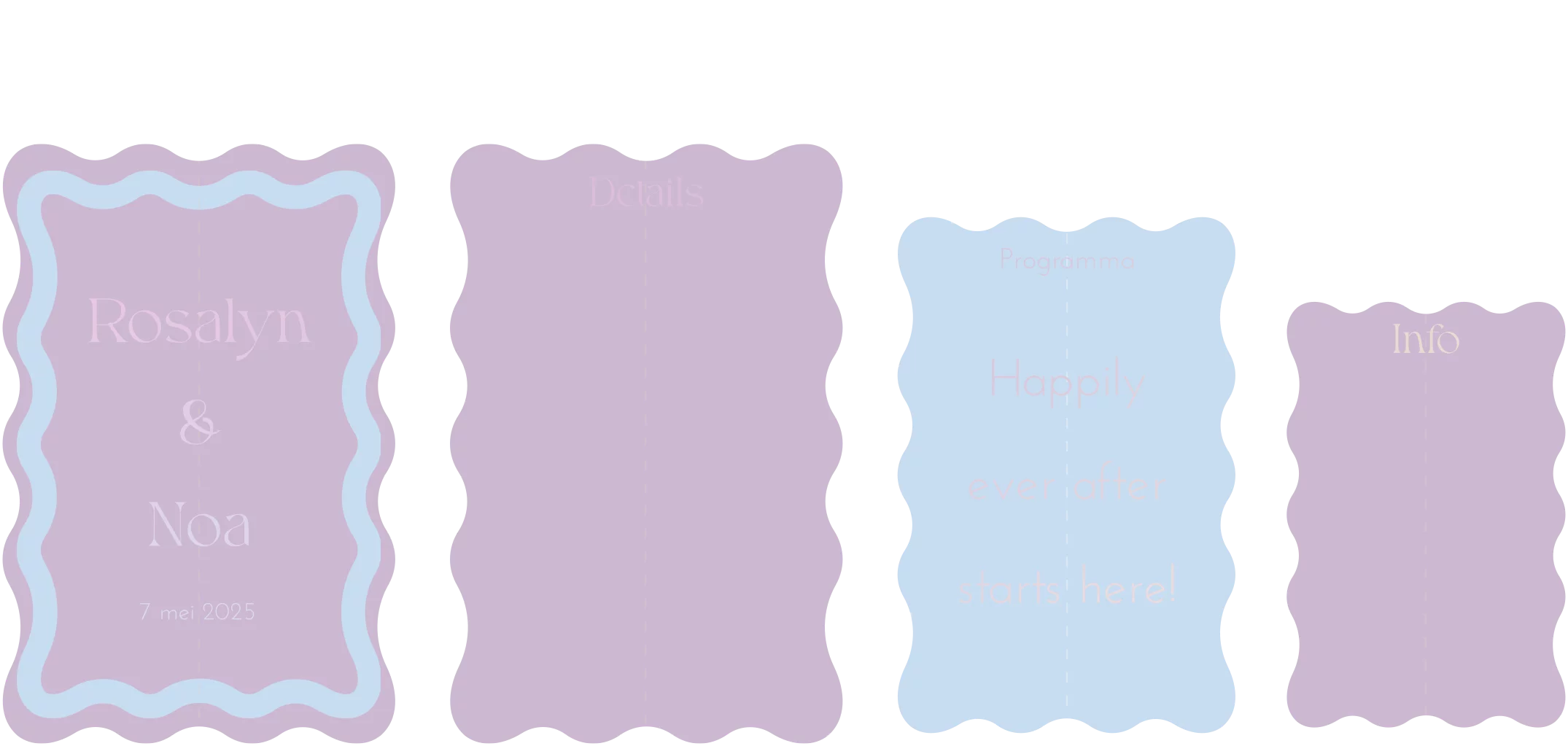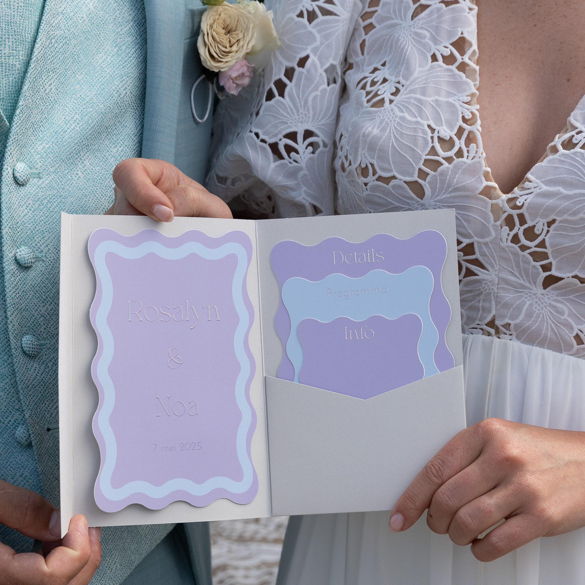 Hippe en kleurrijke trouwkaart set voor in een pocketfold mapje. De cloud grey past hier heel mooi bij! Deze kaart is bijna hysterisch te noemen en toch is hij perfect. De kleuren lila en lichtblauw worden nog eens versterkt door de holografische folie. Kortom: echte Festival vibes, deze te gekke pocketfold set! Rosalyn en Noa