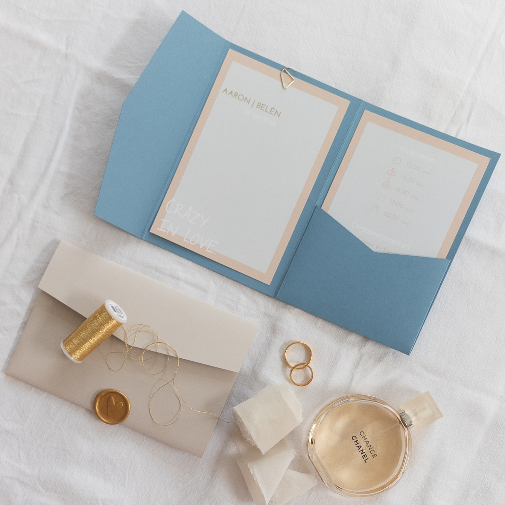 Pocketfold trouwkaart set beige blauw wit goudfolie