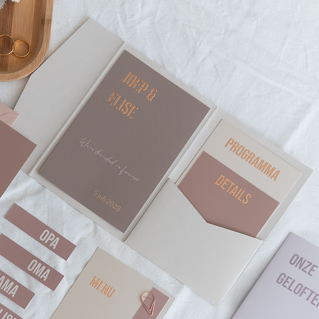 Pocketfold trouwkaart set beige bruin rosefolie