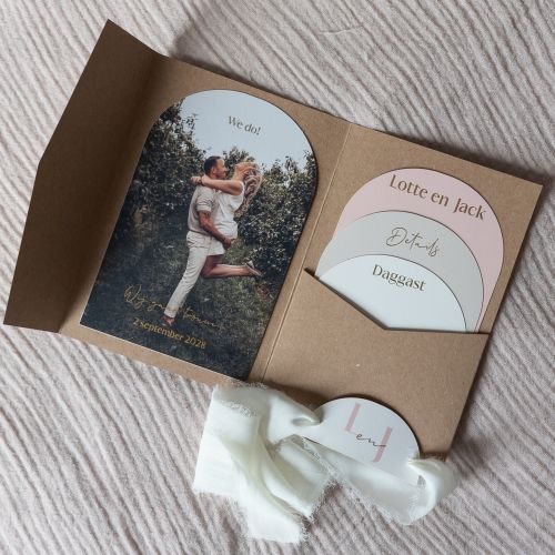 Een cadeautje in de brievenbus, deze chique en stijlvolle trouwkaarten set in ecru, beige en poederroze!