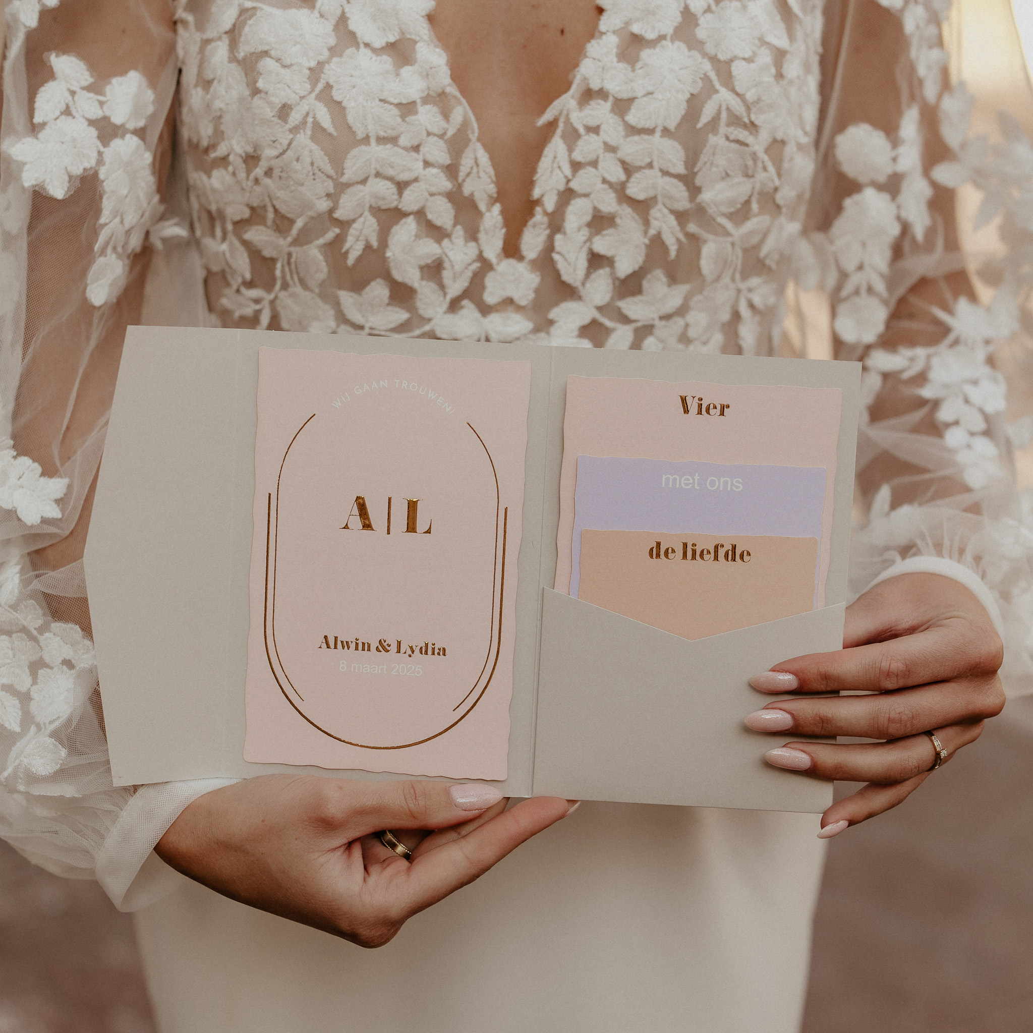 Pocketfold trouwkaart set handgeschept look pastel goudfolie