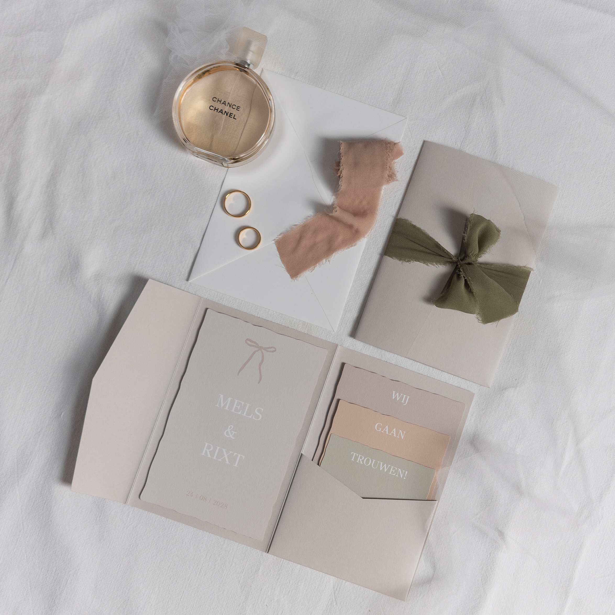 Vind je wit te saai, maar wil je ook niet té veel kleur? Dan is deze pocketfold trouwkaart set in deze tinten perfect voor jou!