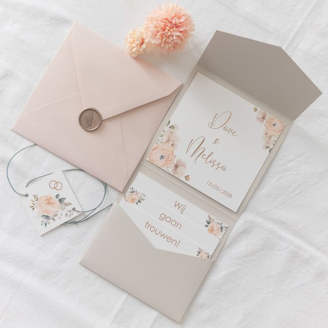 Chique trouwkaarten set met beige en roze bloemen met roséfolie details.