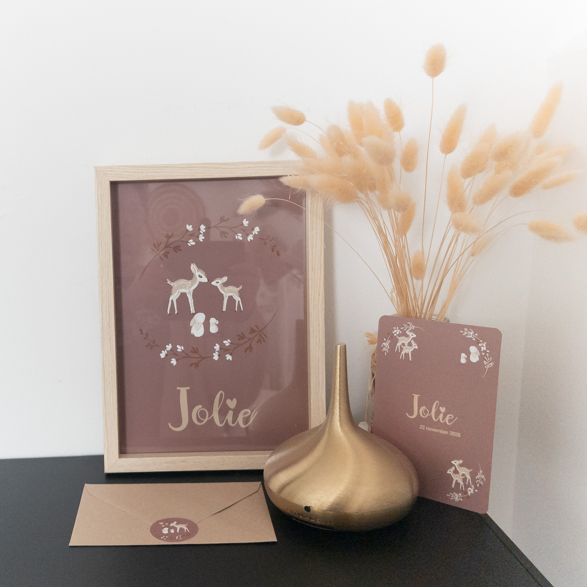 De poster past bij het geboorte kaartje Jolie, een aanwinst op de babykamer! De naam is in UV spotlak afgedrukt. Maak je eigen poster of stuur een berichtje zodat we kosteloos een poster design in je account kunnen klaar zetten.