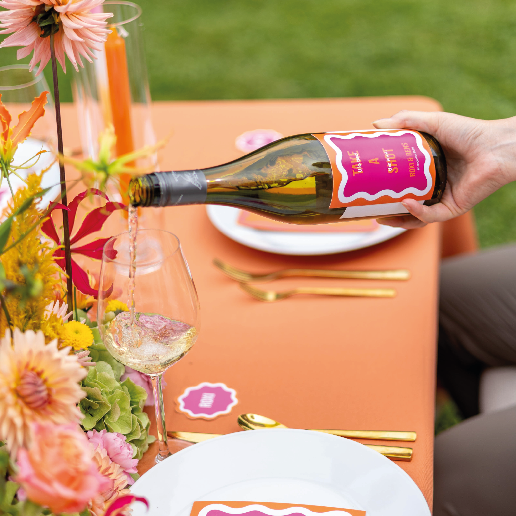 Felgekleurd wijn etiket om zelf te maken. Je ontvangt 5 etiketten op een mat stickervel en de etiketten zijn 8 cm breed en 11 cm hoog. Natuurlijk kun je kleuren en lettertypes naar wens bewerken! Het etiket kun je op de champagneflessen of wijnflessen op tafel plakken. Deze variant past bij de trouw huisstijl van Roxi en Rens en heet Fiesta forever.