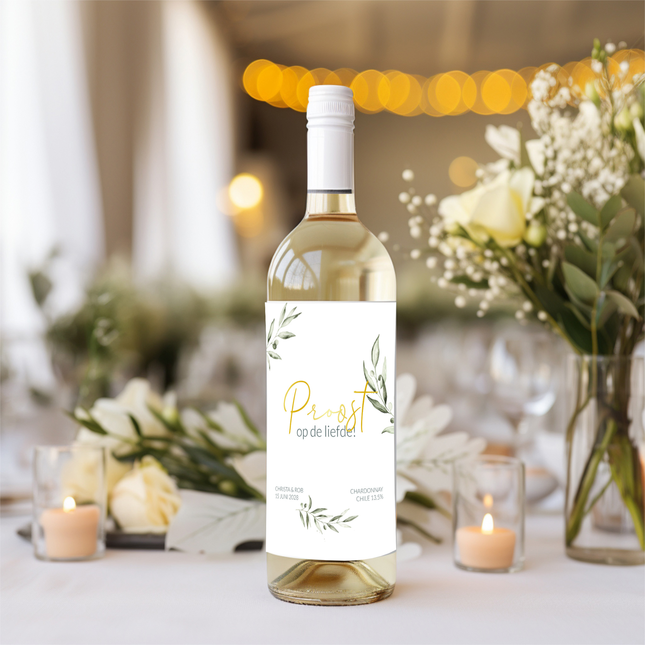 5 unieke wijnetiketten met een afmeting van 8 bij 11 cm die je los van elkaar kunt bewerken. Zo kun je je hele familie verrassen met jullie grote nieuws, of bedanken na afloop van jullie huwelijk.