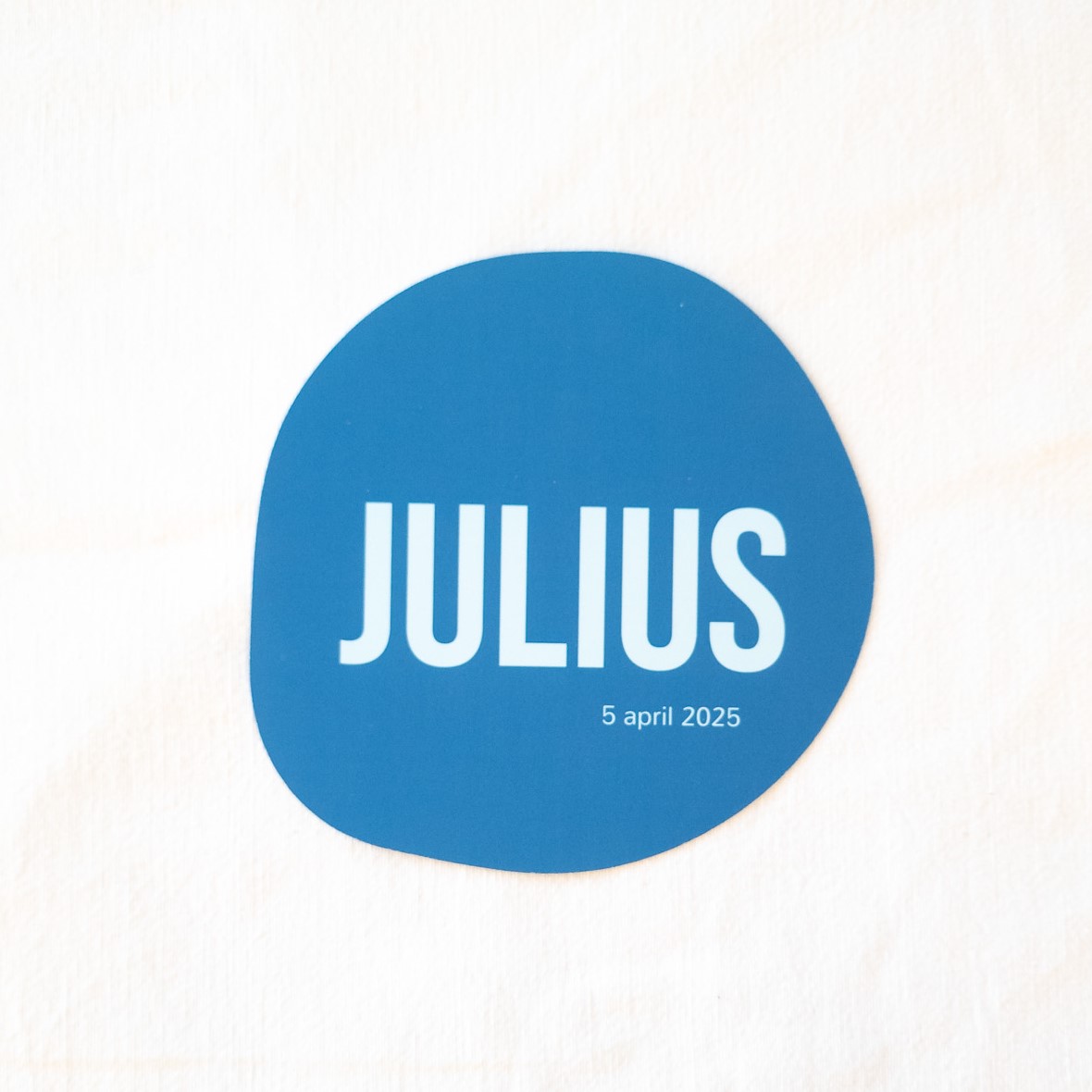 Geboortekaartje in ronde grillige vorm. Dit kaartje is stoer en lief tegelijk. Lekker frisblauw, een echt jongenskaartje!