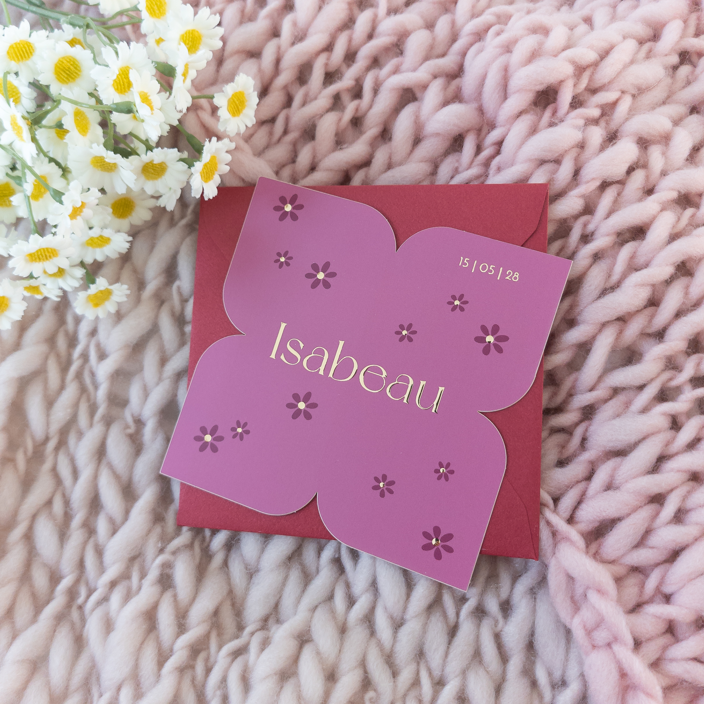 Lief geboortekaartje in bloemvorm met cherry kleurige madeliefjes en goudfolie bloemhartjes en accenten. De vorm maakt dit tot een super origineel geboortekaartje. Je kunt het formaat van het kaartje zelf kiezen. De kaart heeft trendy kleurrijke kleuren die je naar wens kunt aanpassen.