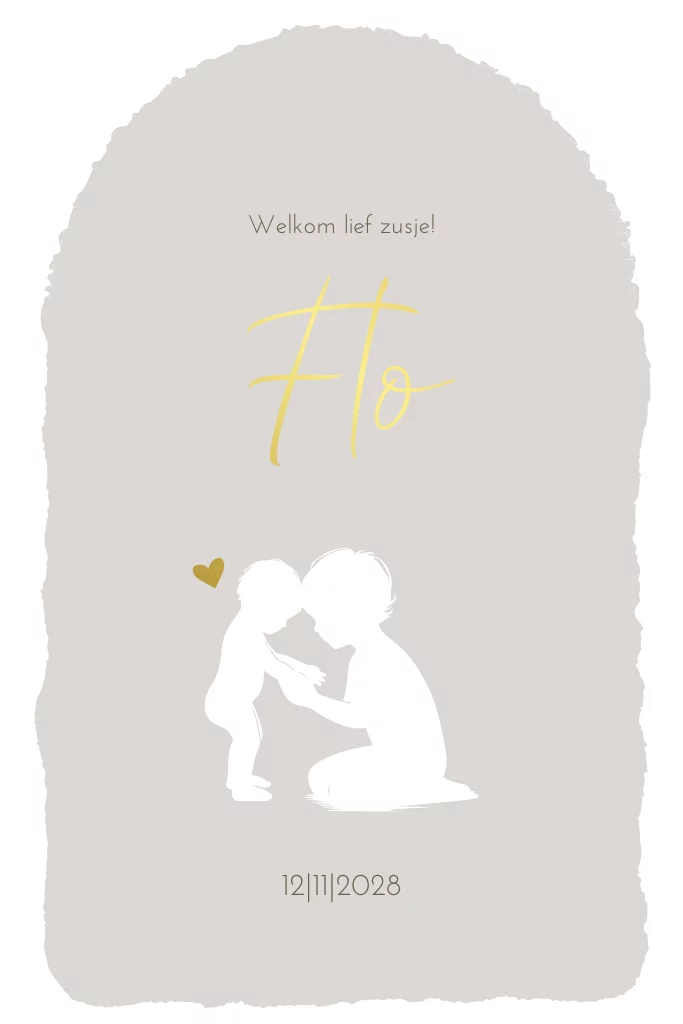 Geboortekaartje met geverfd vlak look in boogvorm, gecombineerd met goudfolie. Gecombineerd met een lief silhouet van een broertje met een baby zusje. Mooi in formaat 11x17 cm op de papiersoort linnen!