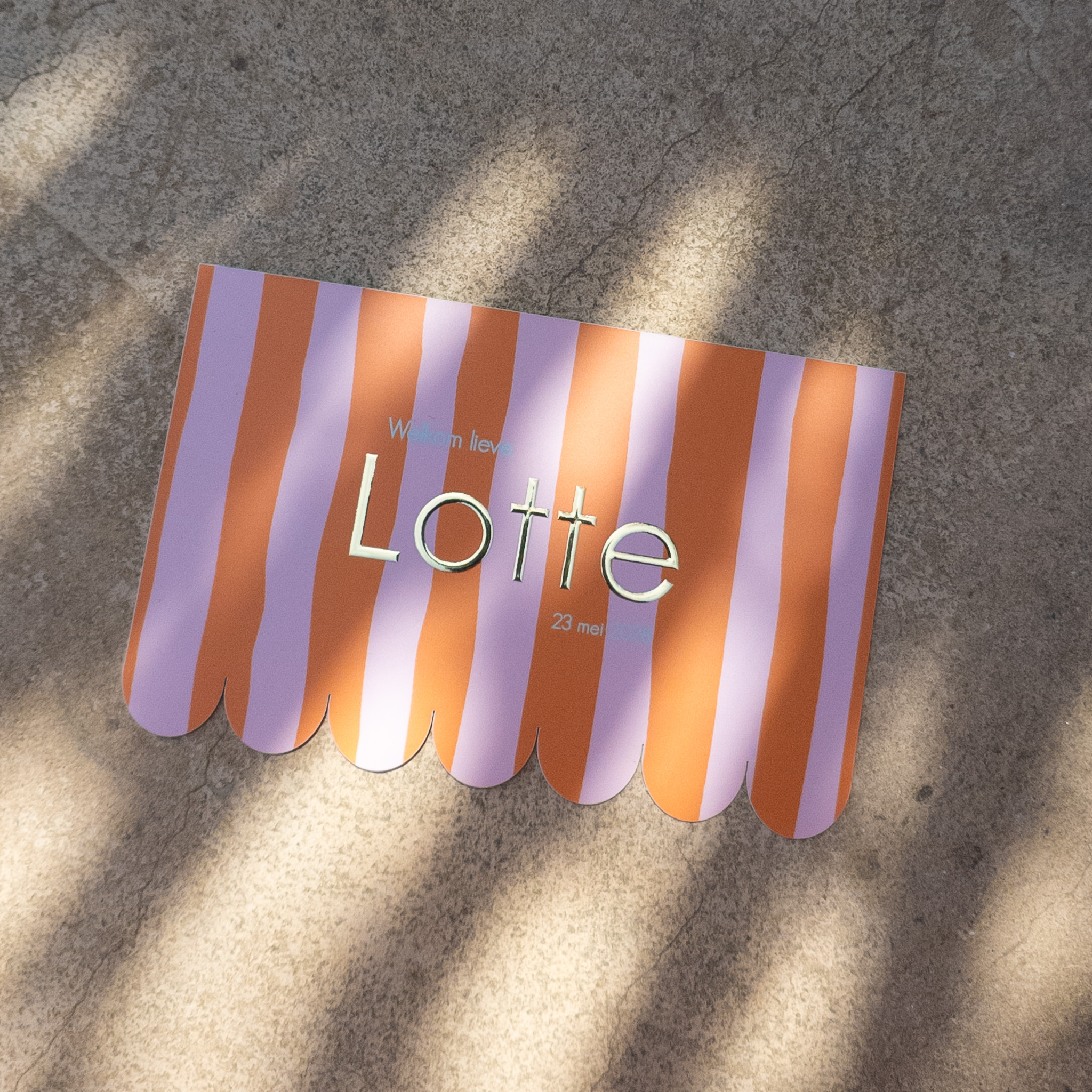Trendy geboortekaartje in oranje met roze streep patroon met goudfolie. De detail teksten op de voorkant zijn in turquoise blauw gedrukt, maar zijn natuurlijk aan te passen naar jouw favoriete kleur of foliedruk.