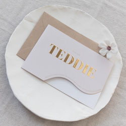 Prachtig minimalistisch geboortekaartje in beige met een golfrand aan de onderzijde van de voorkant. De achterkant is recht. De tekst is in dezelfde golf beweging gemaakt. Let op: deze tekst kan niet worden aangepast.