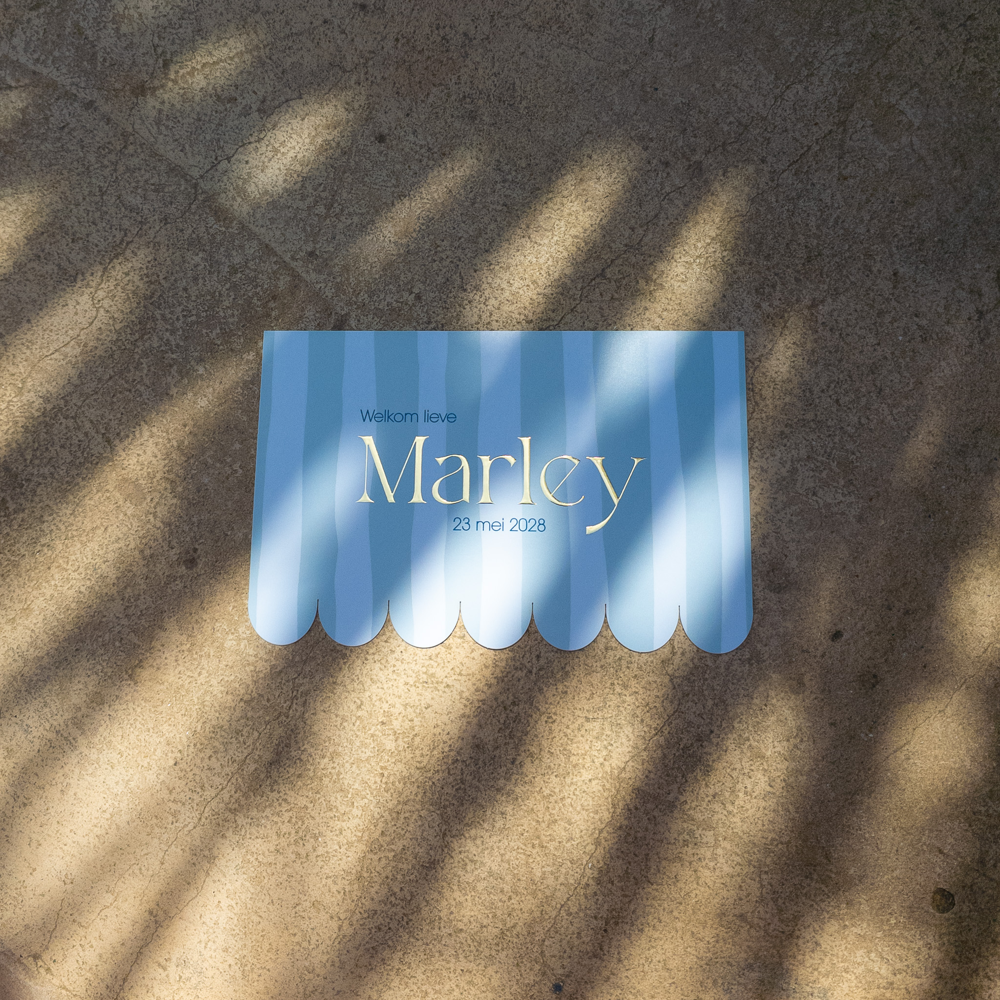Super origineel geboortekaartje in zachtblauw gestreept met wit. De teksten zijn in fris blauw en goudfolie weergegeven, maar zijn gemakkelijk om te kleuren naar jouw favoriete kleur of foliedruk.