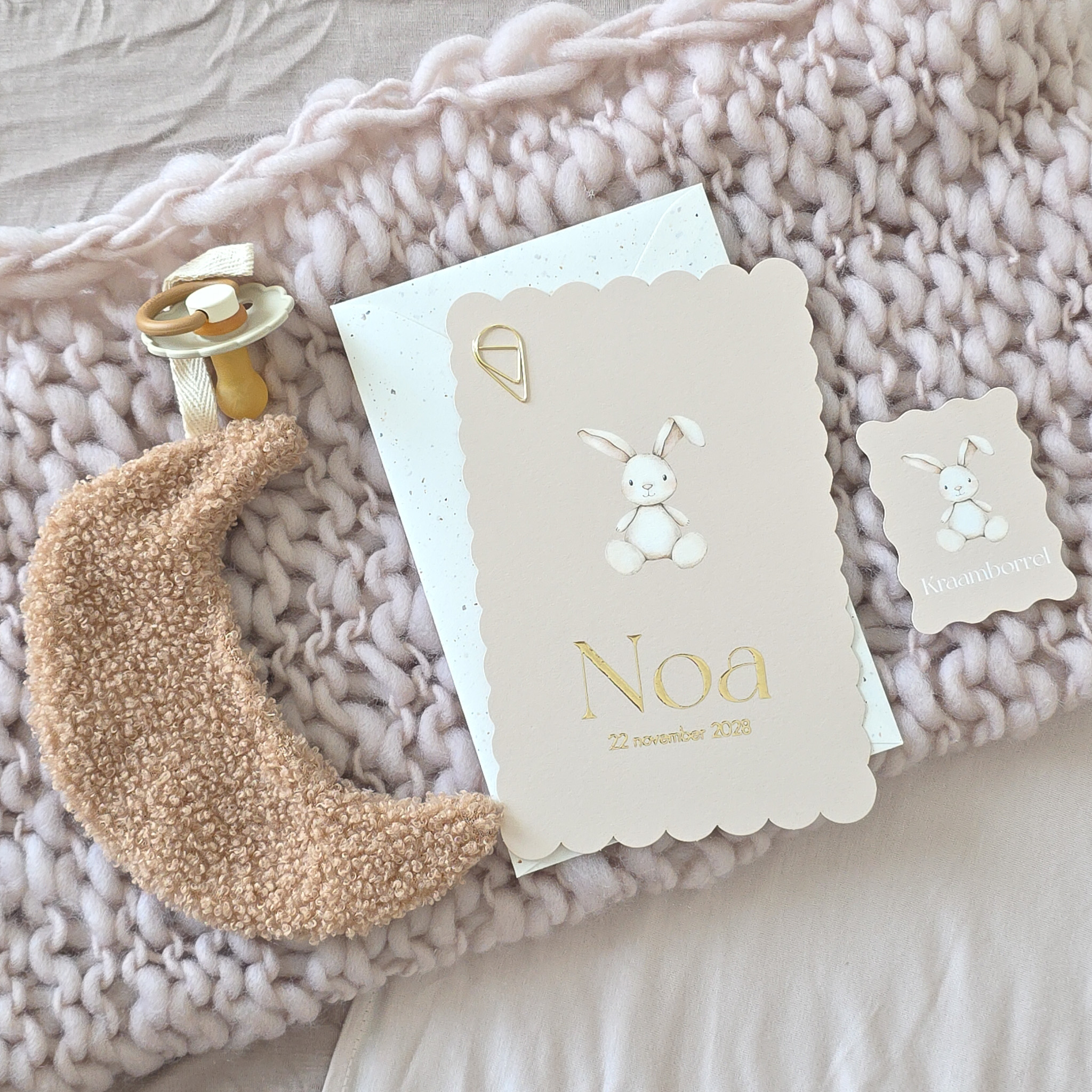 Neutraal geboortekaartje in beige kleuren met koekjesvorm stansvorm. Het schattige konijntje zie je ook de achterkant weer terug!