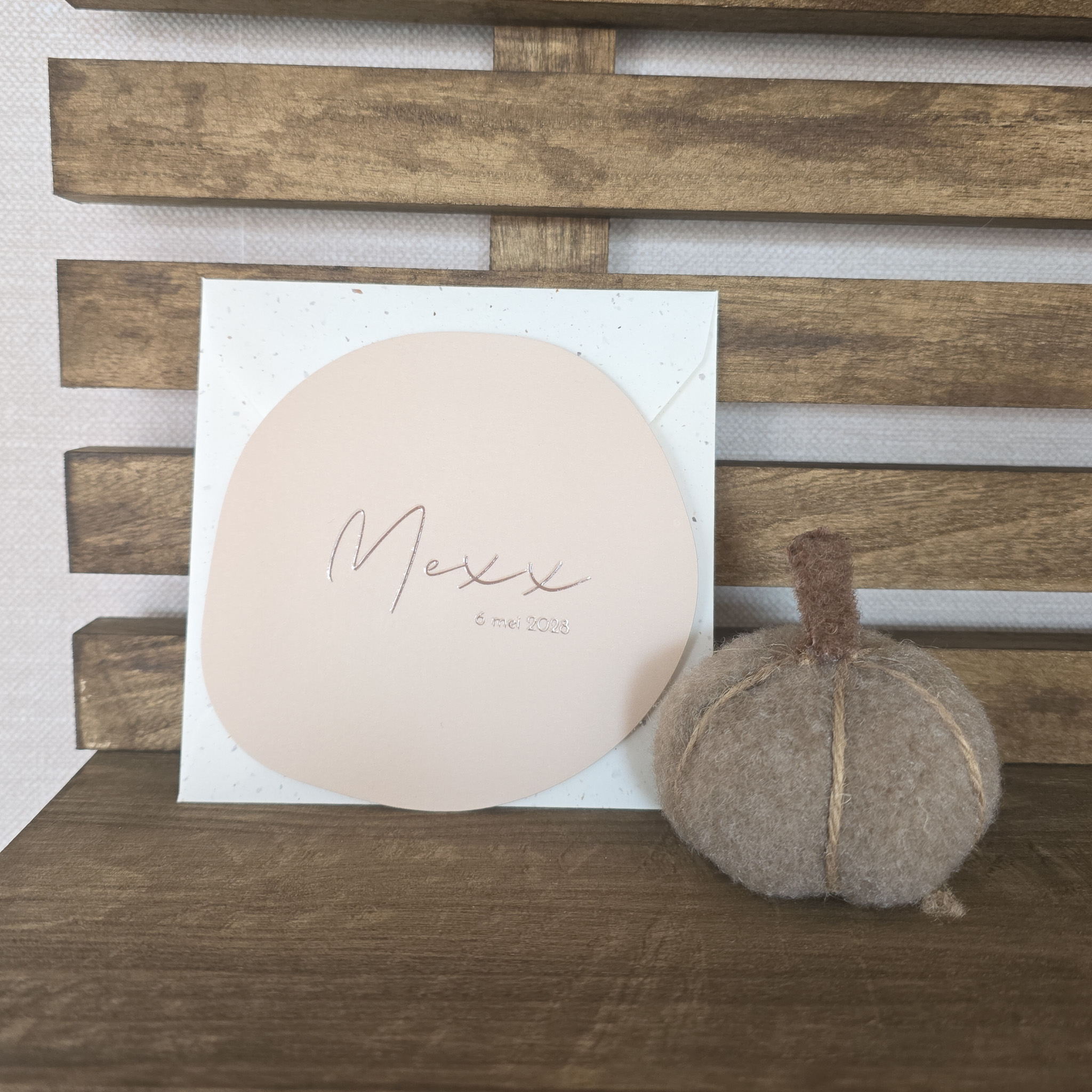Geboortekaartje in ronde organische vorm met subtiele details. Dit lieve, kleine en stoere kaartje in een zacht beige kleur heeft hoogglans lak in een donkerdere bruine tint op de naam en datum aan de voorkant. Doordat er voor een fijn lettertype is gekozen, doet het kaartje klein en subtiel aan.