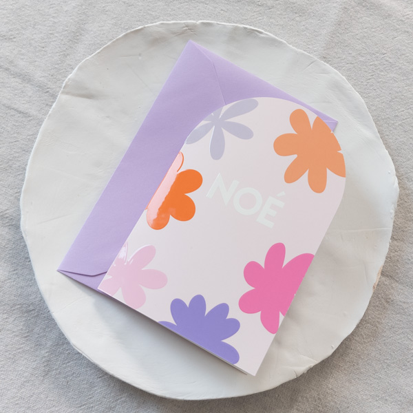 Dubbel boogvormig geboortekaartje met grote bloemen in vrolijke kleuren met hoogglans lak erover. Zomers geboortekaartje met boogvorm.