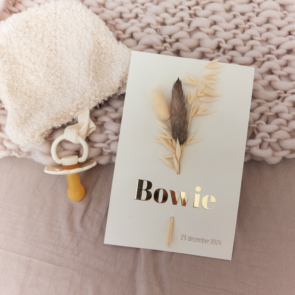 Genderneutraal geboortekaartje beige met droogbloemen